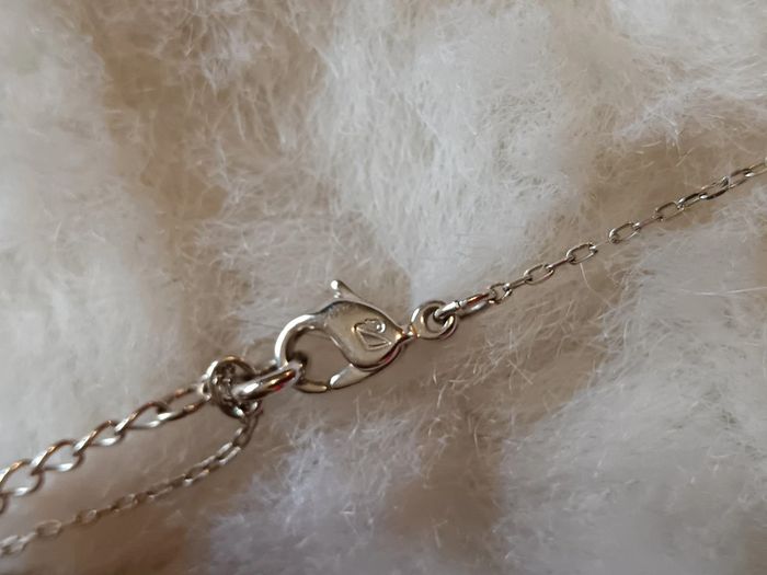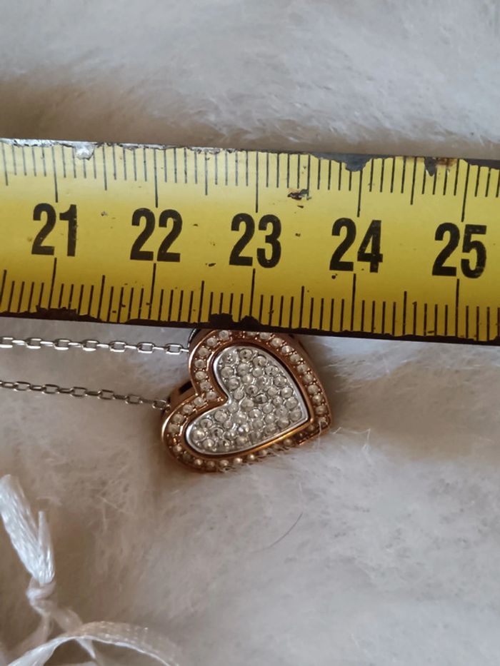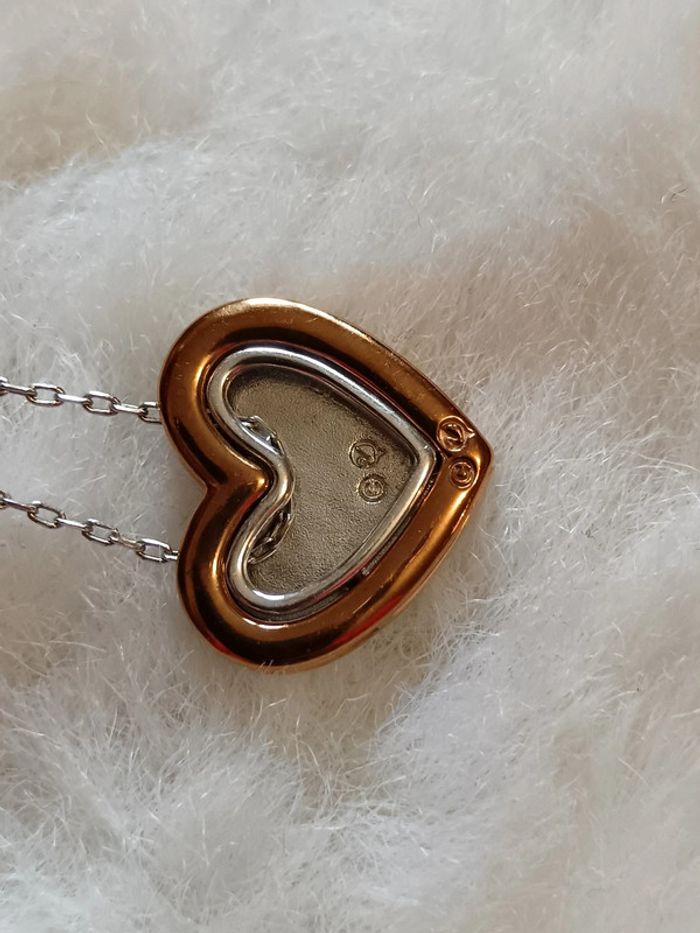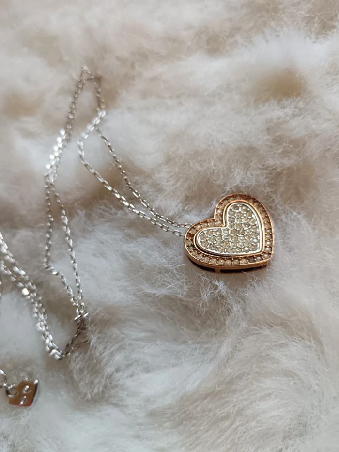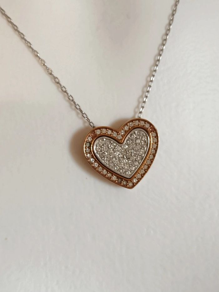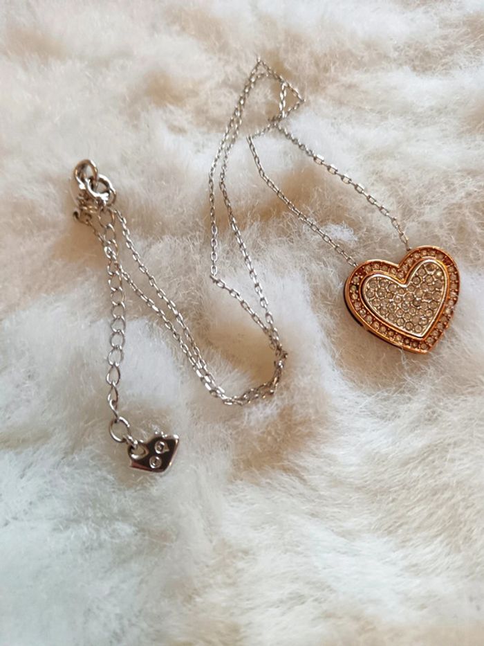 Collier double cœur de chez Swarovski. Double car le cœur gris et son hôte doré se sépare, à porte ainsi, ou l'un à côté de l'autre, ou un des 2 seules. À signaler, voir derniere photos, des strass sont manquant mais vraiment visible que de près. #calmbijoux #collierswarovskicoeur