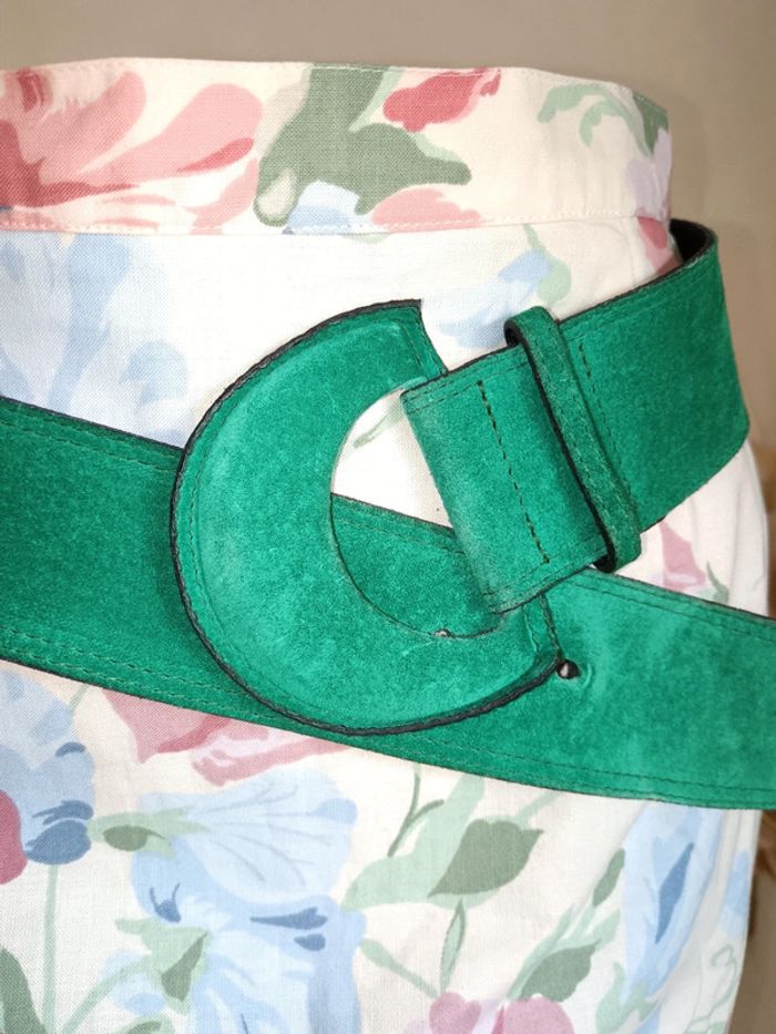 Ceinture en cuir daim vintage de chez Léo Isba. Fermeture à cran, tombé hanche ou croisé à la taille. Un vert profond et un cuir en excellent état. Longueur totale 95cm. 4crans. #calmaccessoire #ceintureleoisba