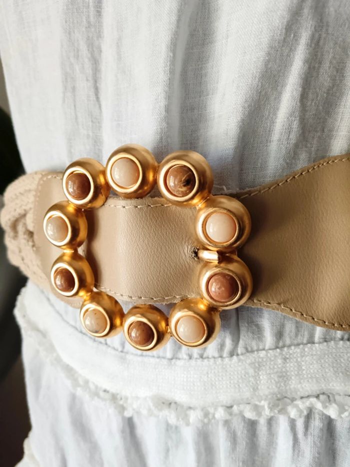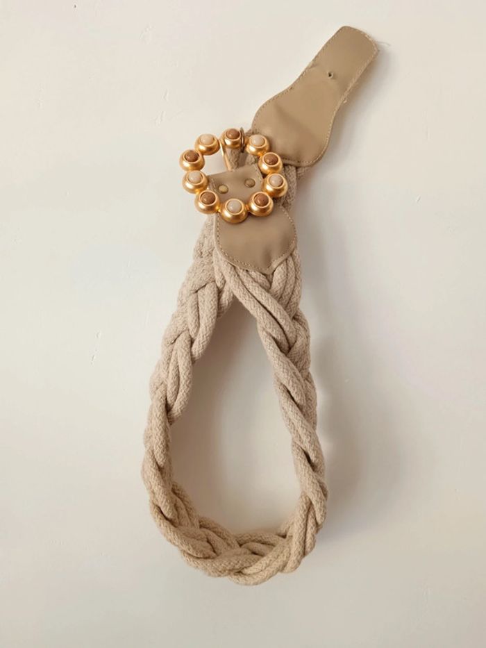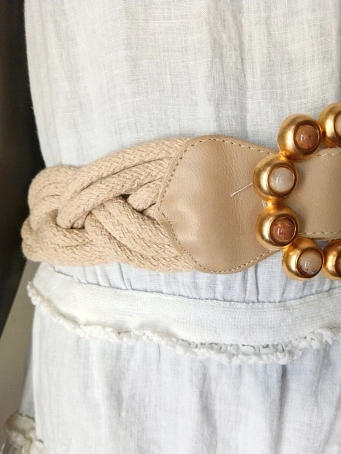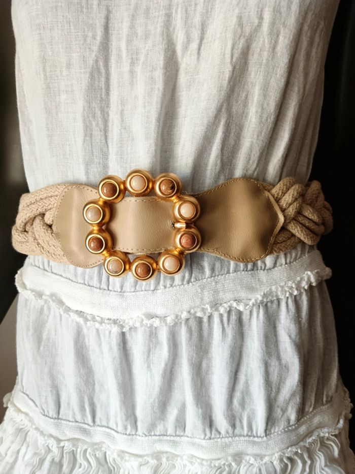 Ceinture vintage en cuir et corde. Boucle métallique garnie de perles imitation pierres. Tresses de cordes épaisse. En excellent état. Taille 85 noté convient à un 80/85 ou trou à rajouter pour plus petit. Longueur 88cm, longueur au trou 80cm Boucle de 7cm #calmaccessoire #ceinturevintage #ceinturecorde