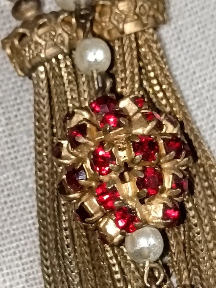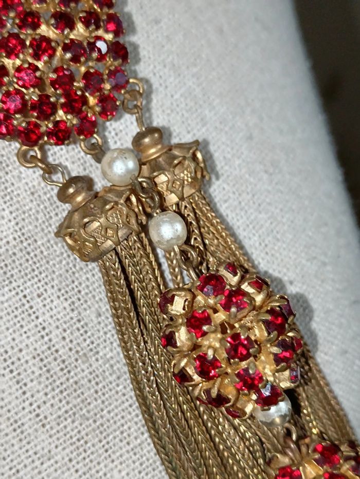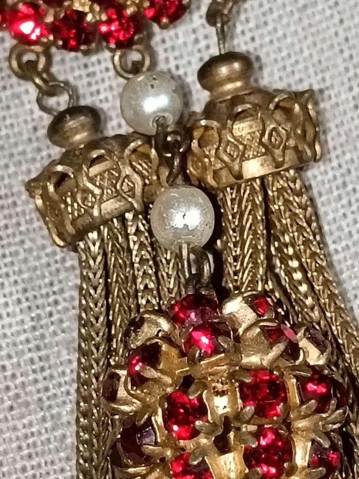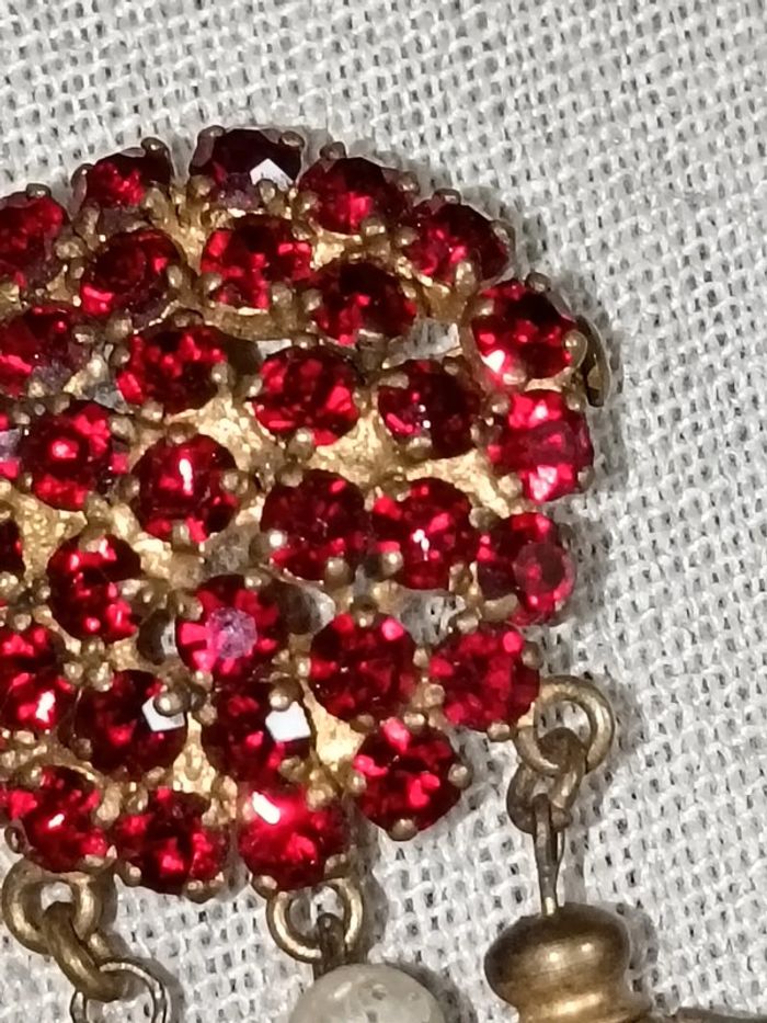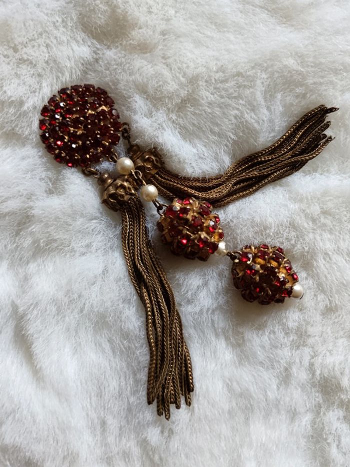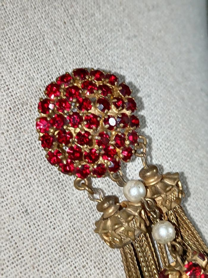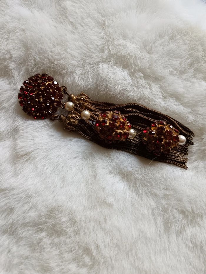 Exceptionnelle broche avec beaucoup de travail et de finesse Métal inconnu aspect laiton et strass de verre rouge. Vintage : cette broche n'est pas 'neuf et à une patine du temps mais est en très bon état #calmbijoux #brochevintage #brocheartdeco #lebijoukorrigan