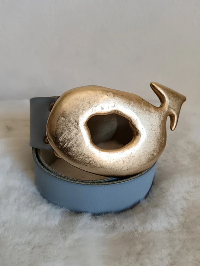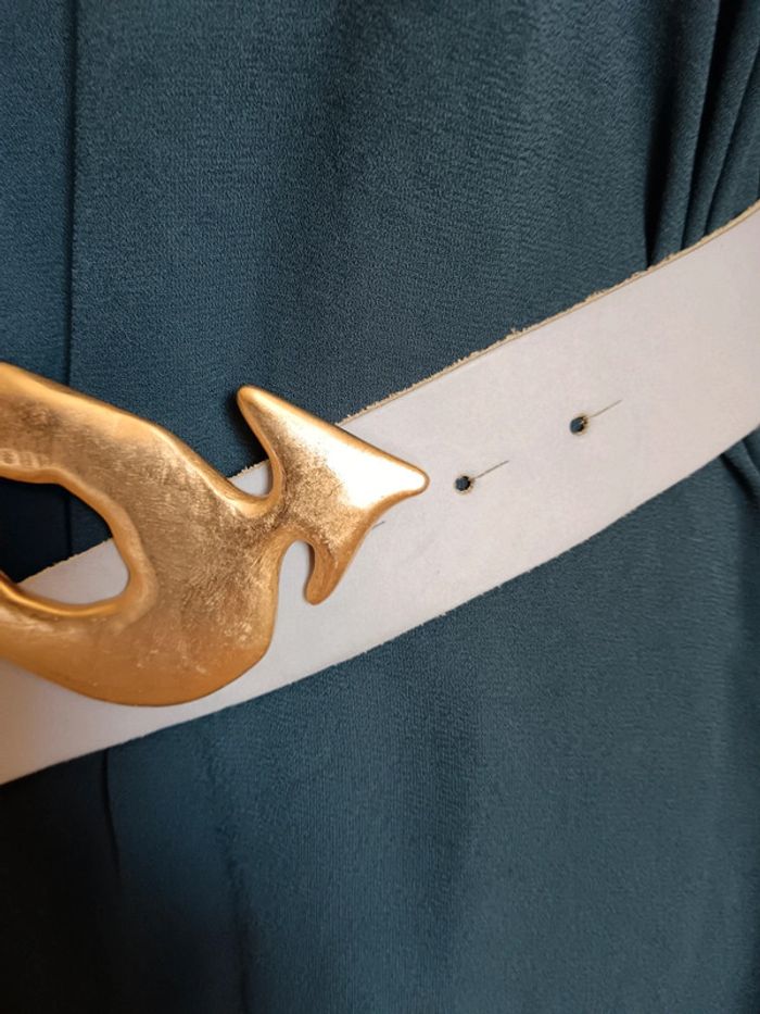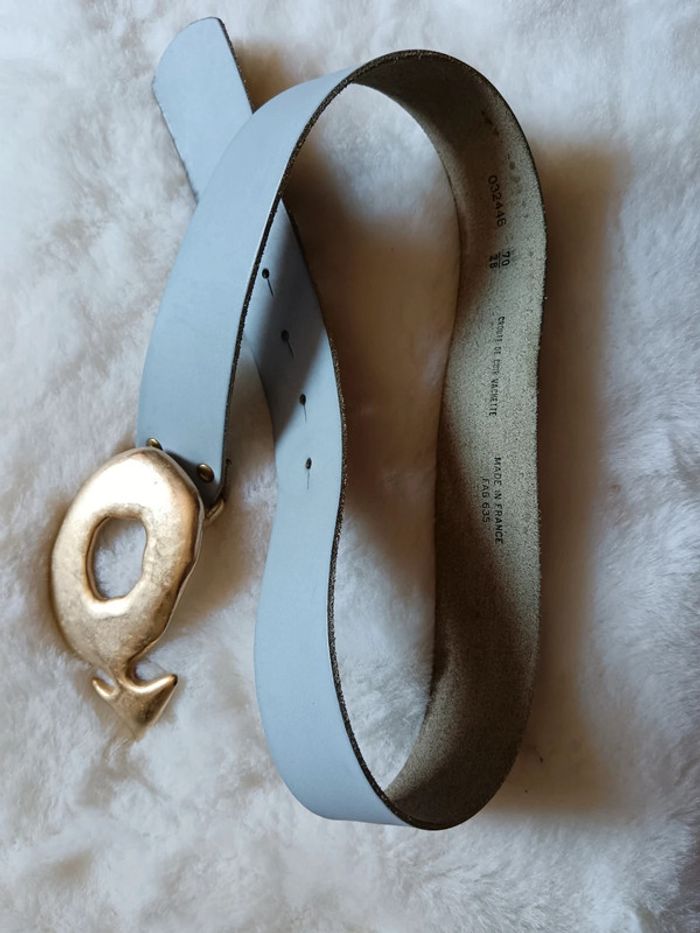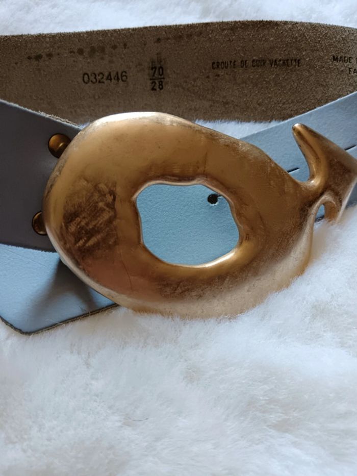 Ceinture très "artistique" ou "engagé " En cuir turquoise, prolongée par une boucle en forme de... Mais non... Il s'agit du dieu romain Mars représentent le bouclier et la lance. Et oui... En excellent état Taille 70 Longueur en photo #calmaccessoire #ceinturevintage #ceinturecuirturquoise
