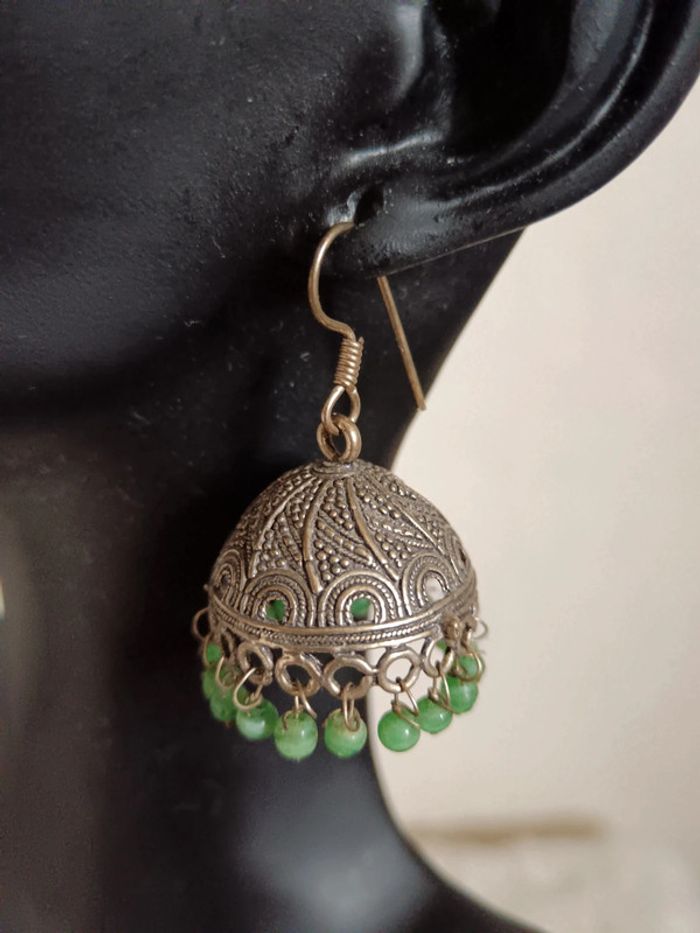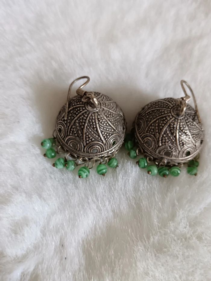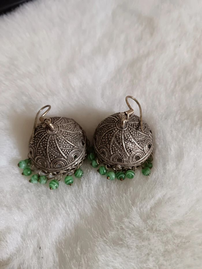Boucles d'oreilles en argent et perles de jade. Indienne, nommé Jhumka Vintage, très anciennes mais en excellent état. #calmbijoux #jhumka