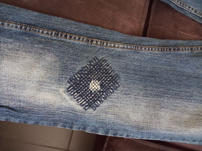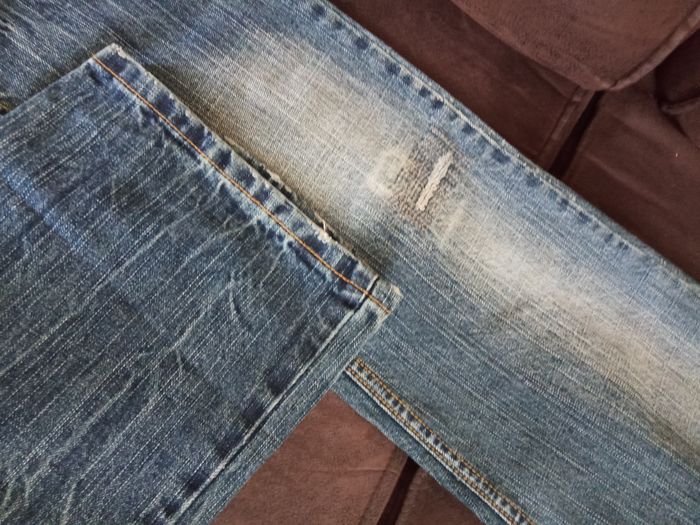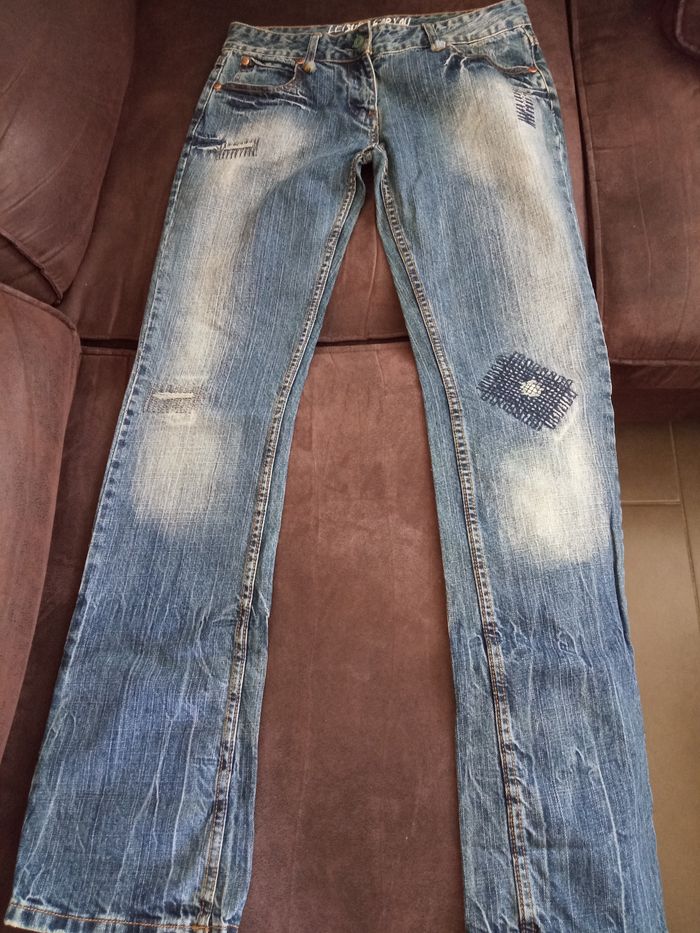 Jeans T40 "Jennyfer" Couleur: Bleu aspect délavé et usé Taille non élastiquée avec passants Poches de chaque côté devant et derrière Fermé devant par bouton et fermeture éclair Coupe tendance Dimensions: Longueur 104,5cm - Entrejambes 84cm - Taille non étirée 40,5cm - Hanches 52,5cm Matière: 100% Coton Jeans peu porté, en parfait état, vendu comme sur les photos