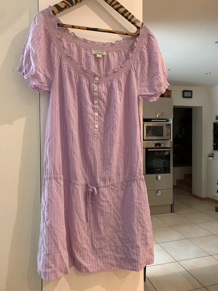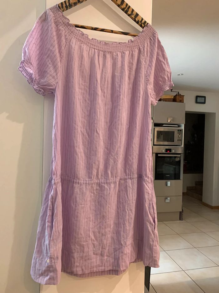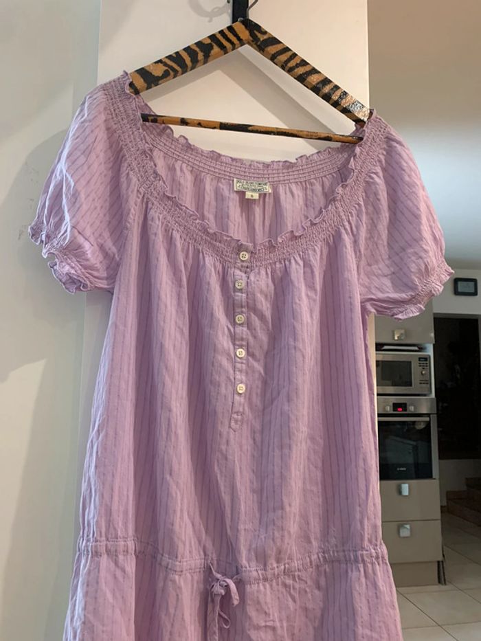 Robe très légère Lilas , cordon à la taille. Taille S . De la marque : - «  Ralph Lauren « . Idéale pour la plage 🏖️ elle 🏝️ légèrement transparente. Elle de poches verticales su chaque côté. Elle a été portée, elle est en excellent état et peut ravir une personne . Merci de prendre en considération les dimensions ci-après : - longueur totale 80 cm, longueur des dessous de bras jusqu’en bas de la robe 64 Cm et longueur de la ceinture à nouer jusqu’en bas de la robe 32 cm. Largeur des manches 15 cm, largeur des aisselles à aisselles 50 cm, largeur de la taille 54 cm et largeur du bas de la robe 66 cm.