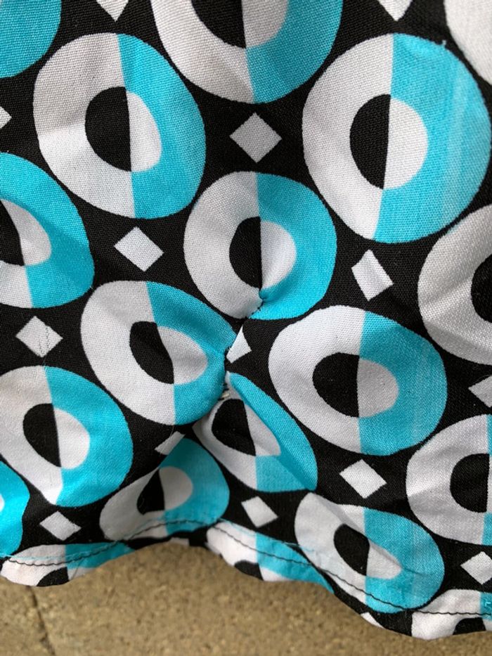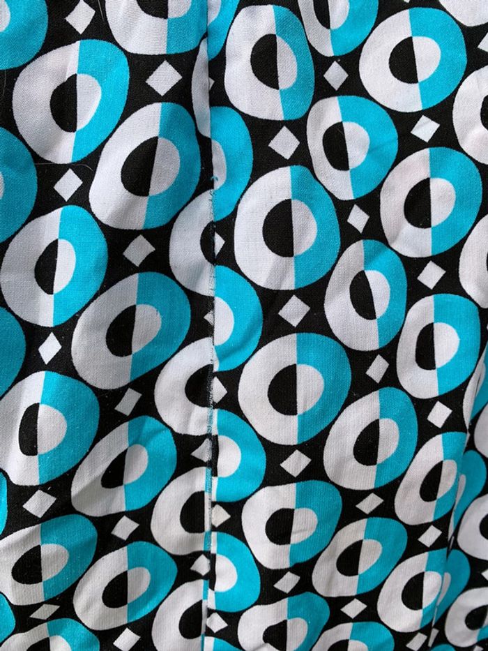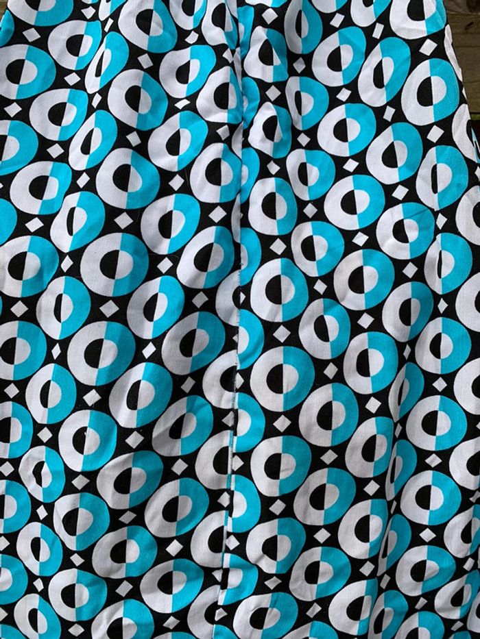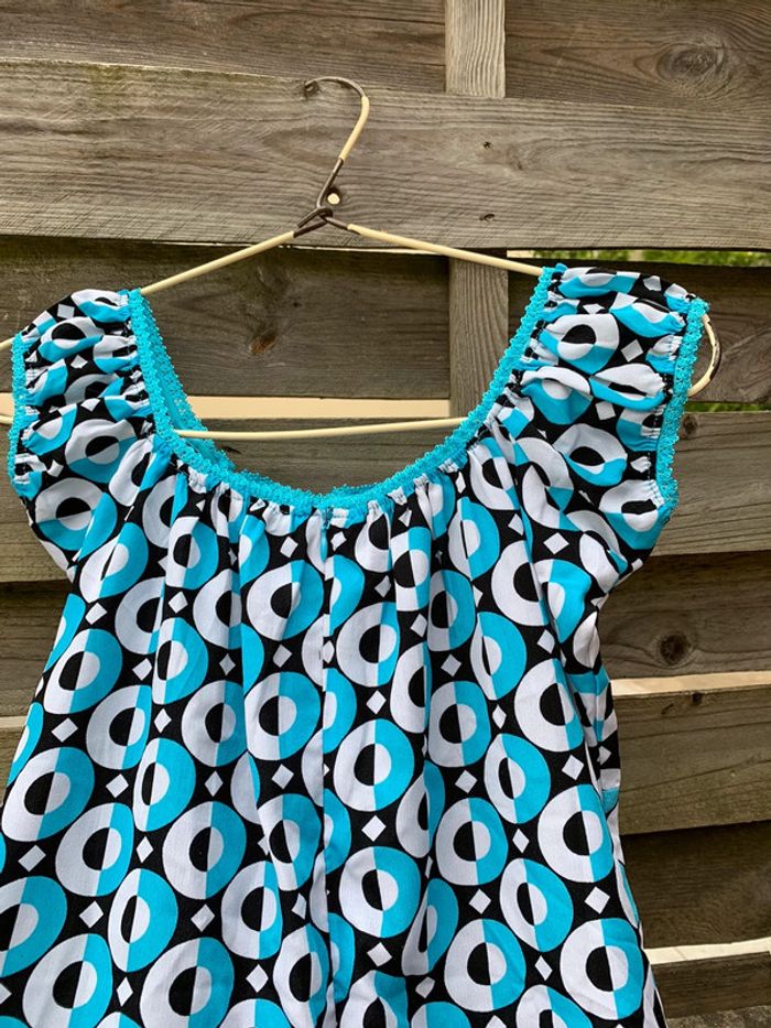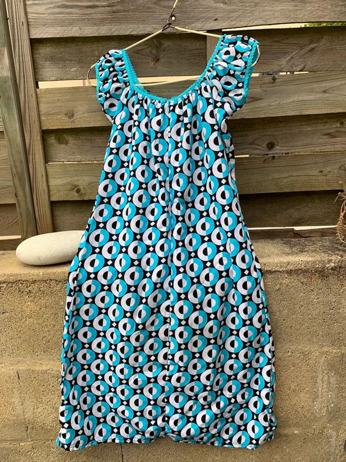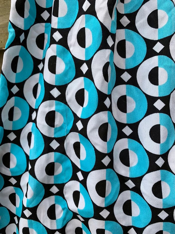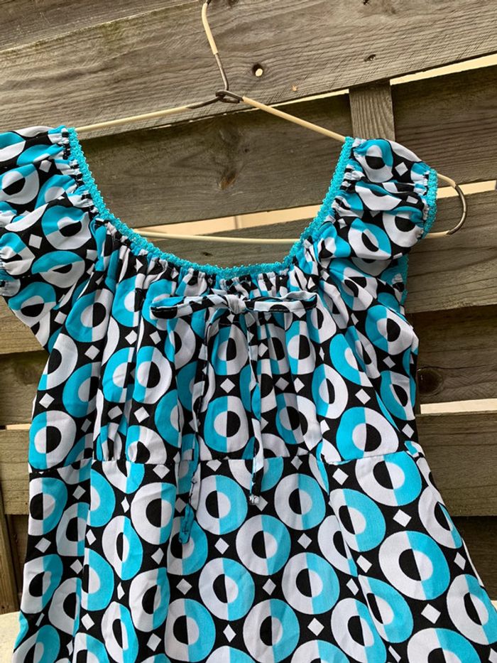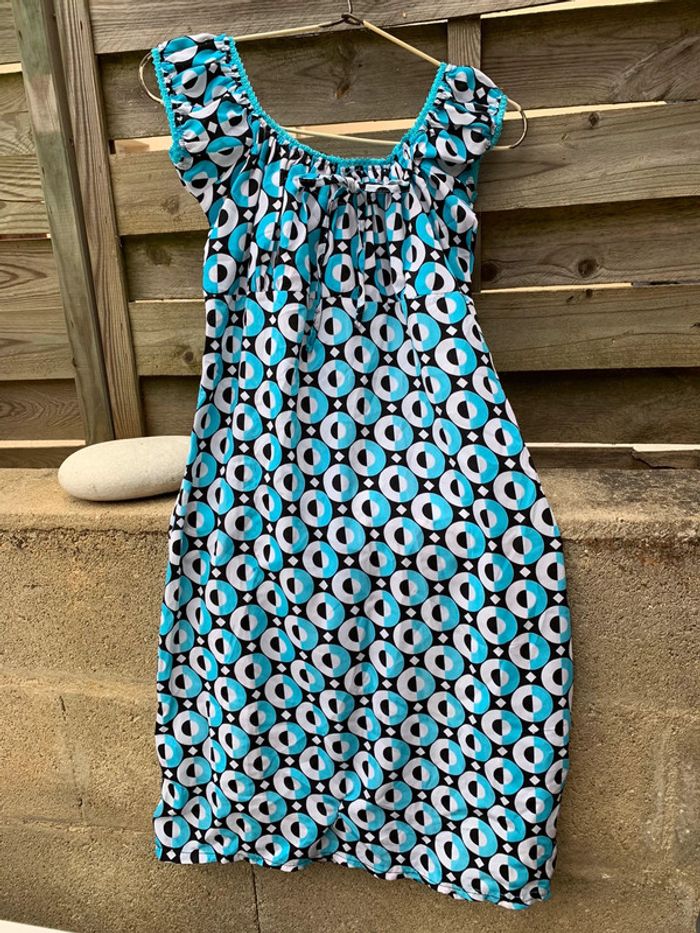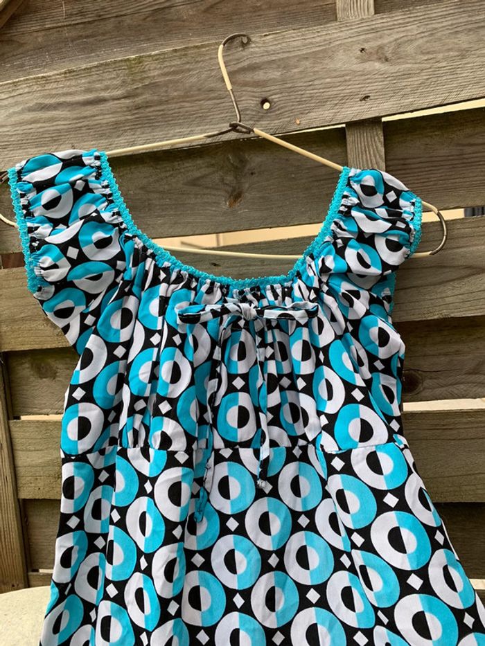 Jolie robe 👗 bleu turquoise, noire, blanche aux jolies formes géométriquement arrondies, il a un look empire romantique et devrait ravir toue jolie femme ou jeune . Elle embellira sans contexte votre teint hâlé et elle fera ressortir votre plus beaux atouts. taille 36/38 Merci de prendre en considération les dimensions ci-après : - Largeur des manches 10,50 cm, largeur des hanches44 cm, largeur dessous de poitrine 39 cm. Longueur du bustier style empire 13 cm, largeur au niveau poitrine 38 cm et longueur de la robe 73,50 cm . Attention⛔️ une reprise ⚠️ a été effectuée voir les photos et un fil 🪡 a été tiré voir les photos. Vous pouvez la customiser en y mettant votre touche personnelle avec un patch. Regardez dans mon dressing.