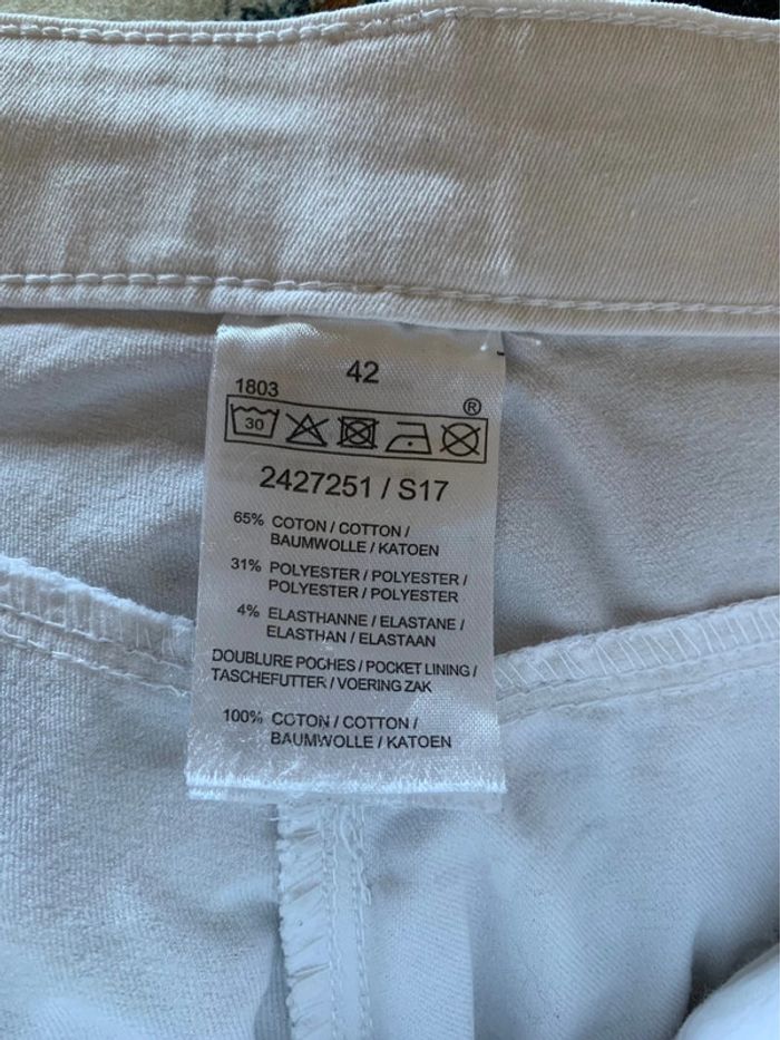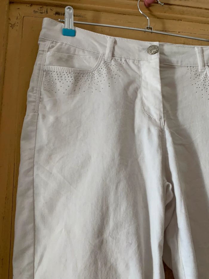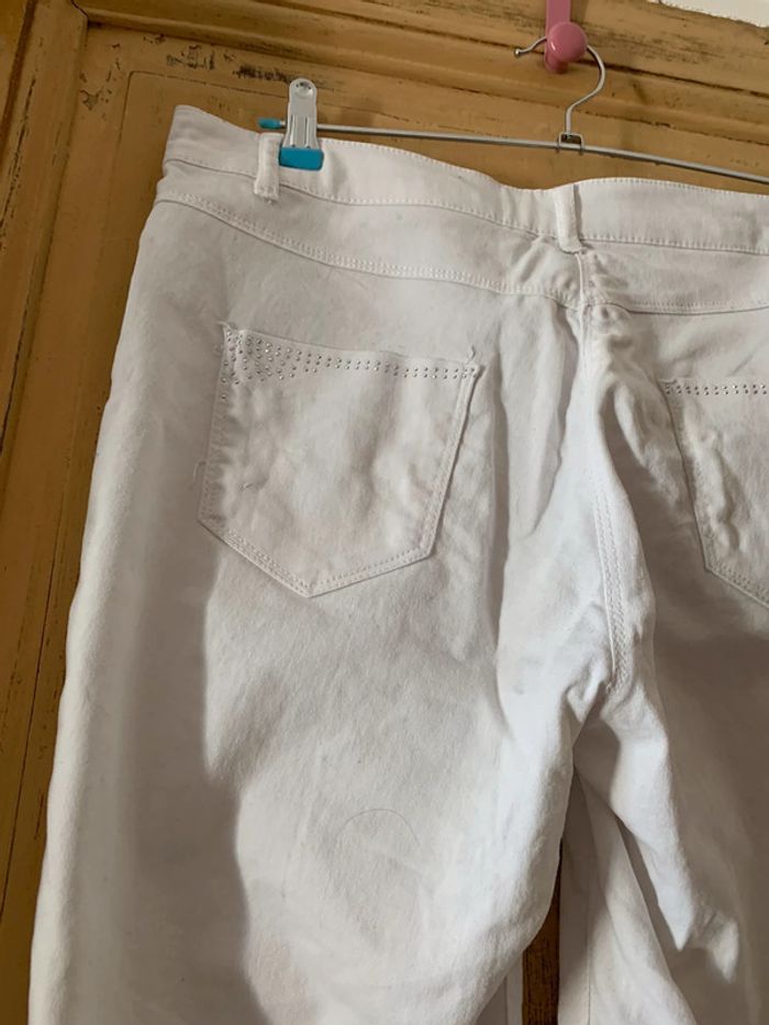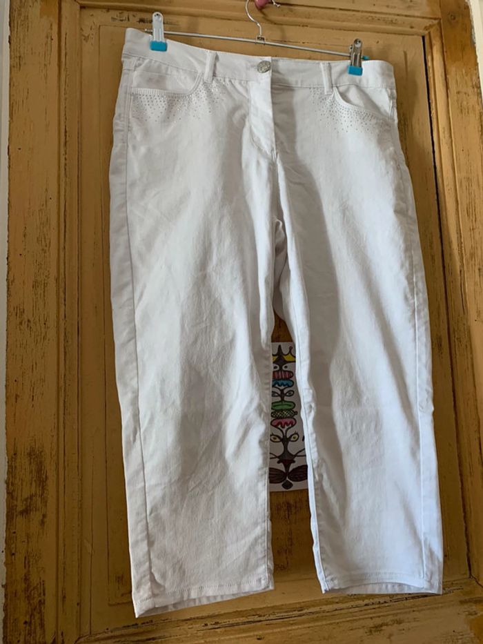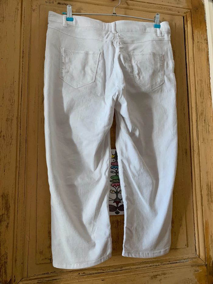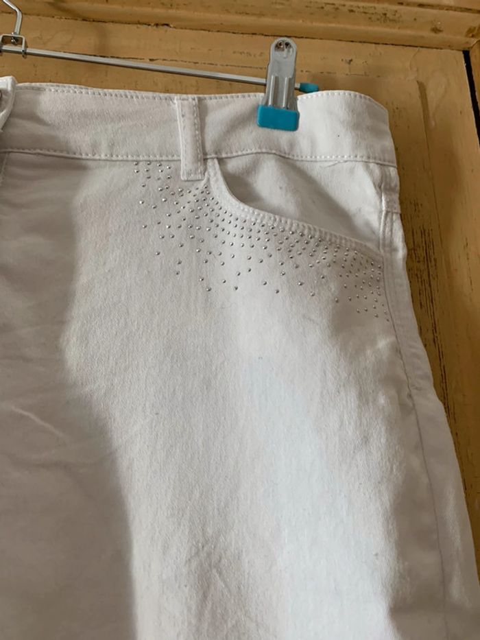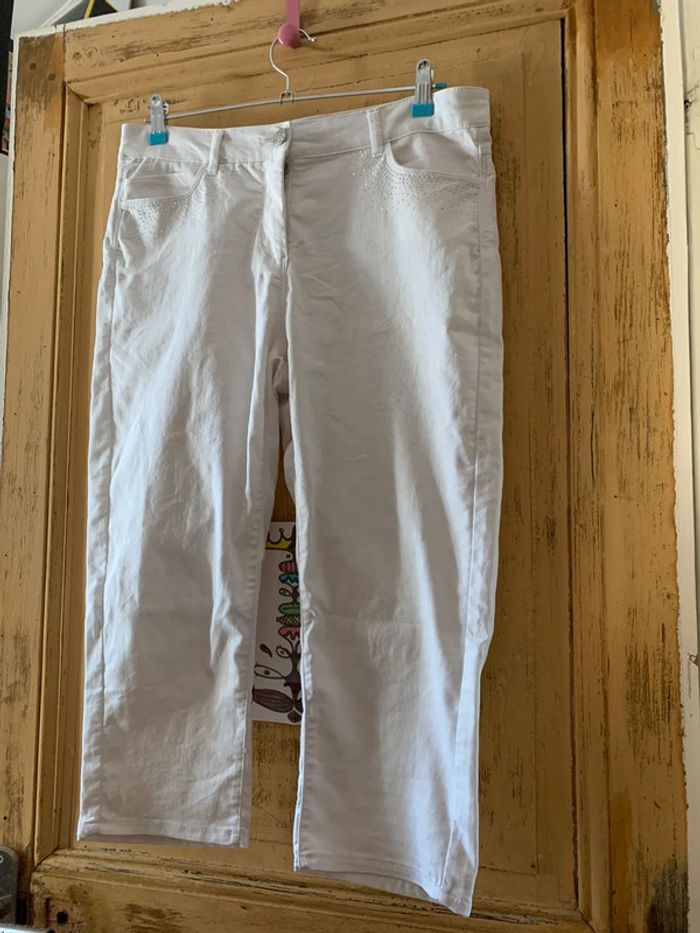 Panta-court paillettes blanc taille 42, il a été porté et comporte quelques petites bouloches côtés droit devant et devant les poches. Mais néanmoins, ce pantacourt peut encore ravir une personne. Merci de prendre en considération les dimensions ci-après : largeur à la taille 41 cm, largeur des cuisses 31 cm, longueur des entrejambes jusqu’en bas 51 cm et largeur du bas 18,50 cm.