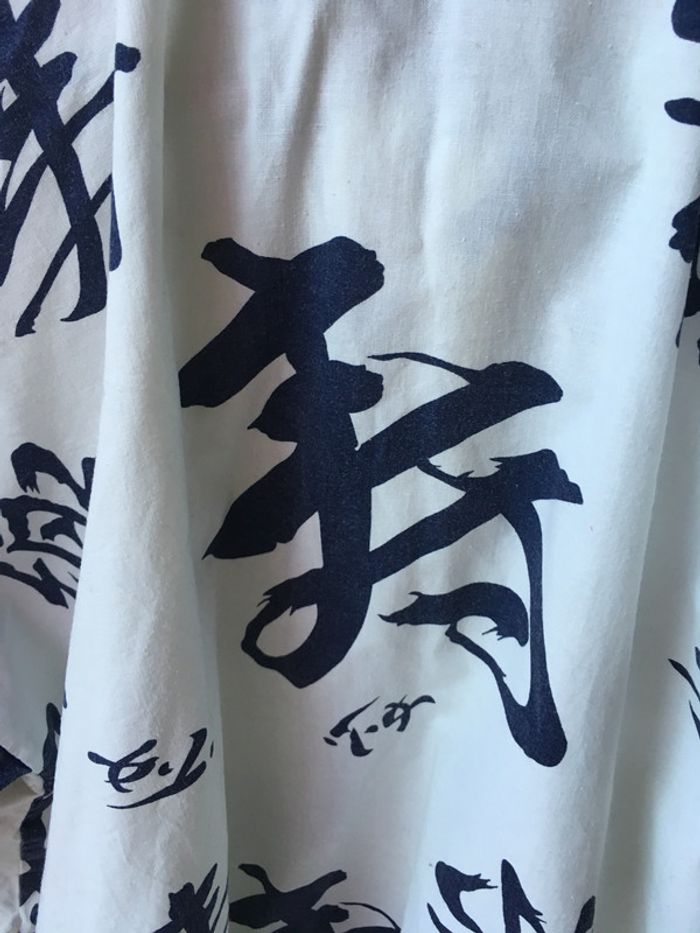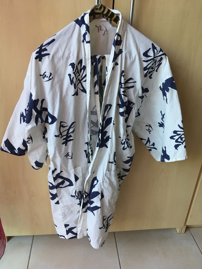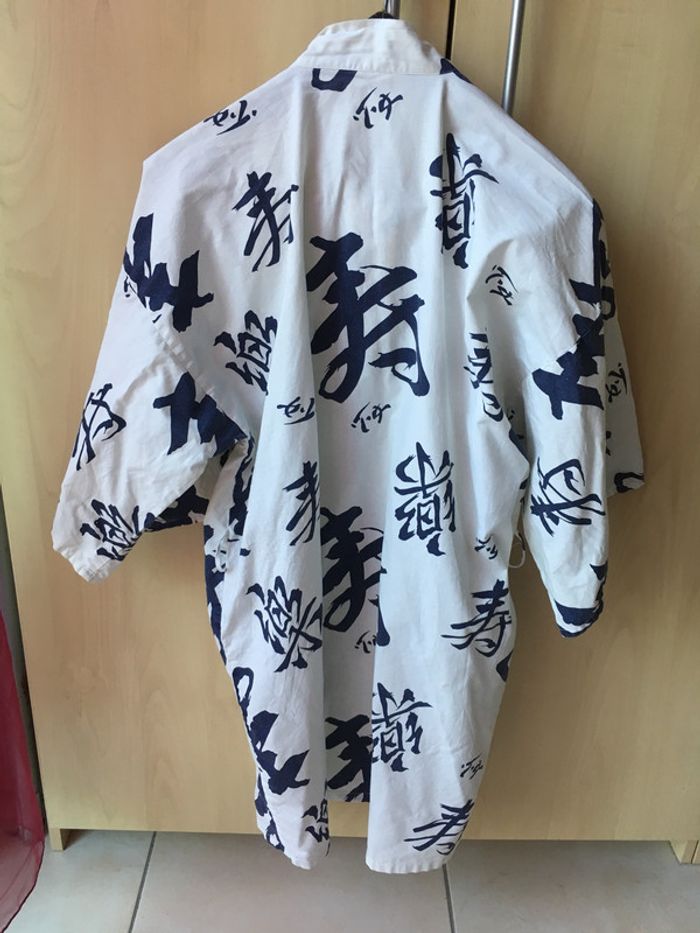 Peignoir blanc symbole chinois taille 40, fabrication par des artistes peintres , il a quelques petites tâches minimes qui devrait partir.