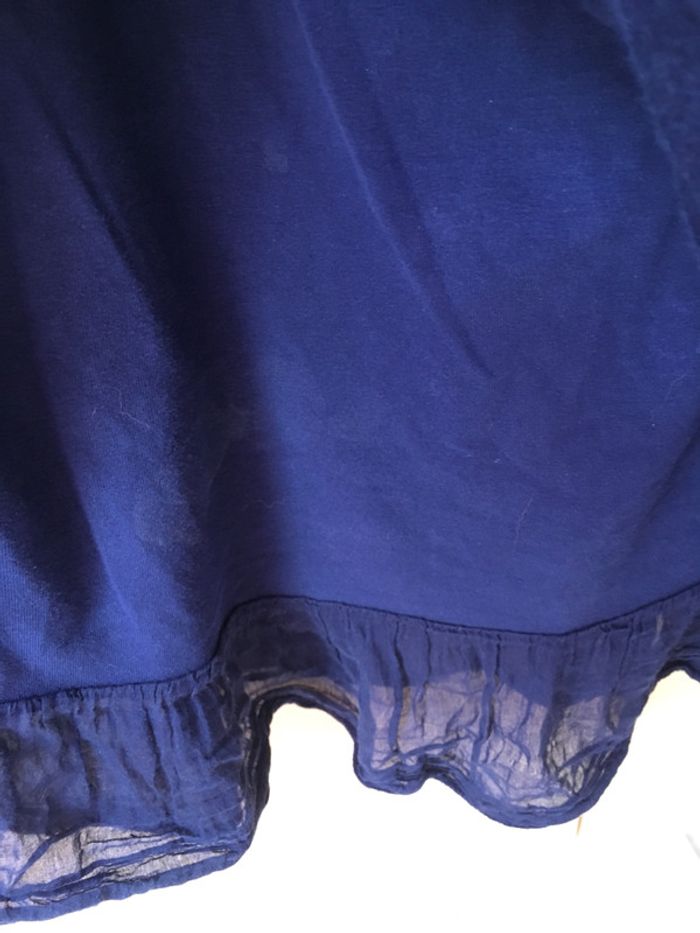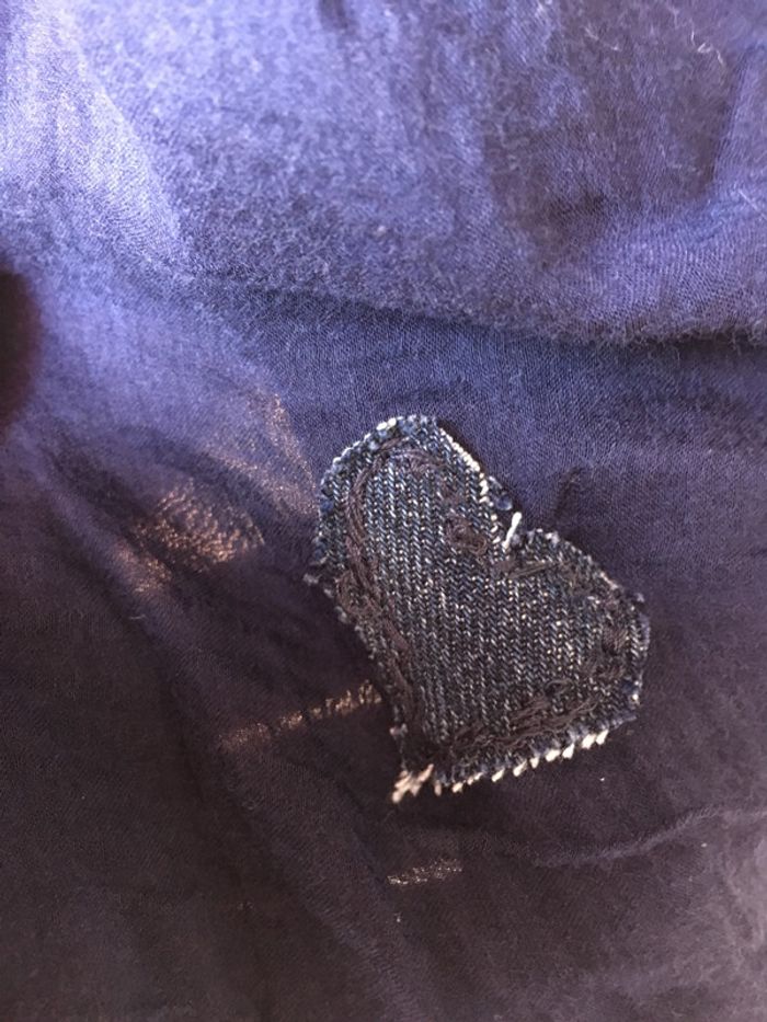 Robe bleu Cache Cache taille 42, une reprise en jean et en forme de cœur à été effectué, petite bouloches légères.