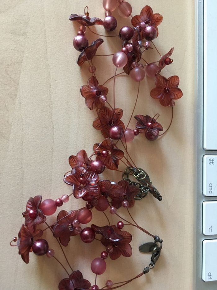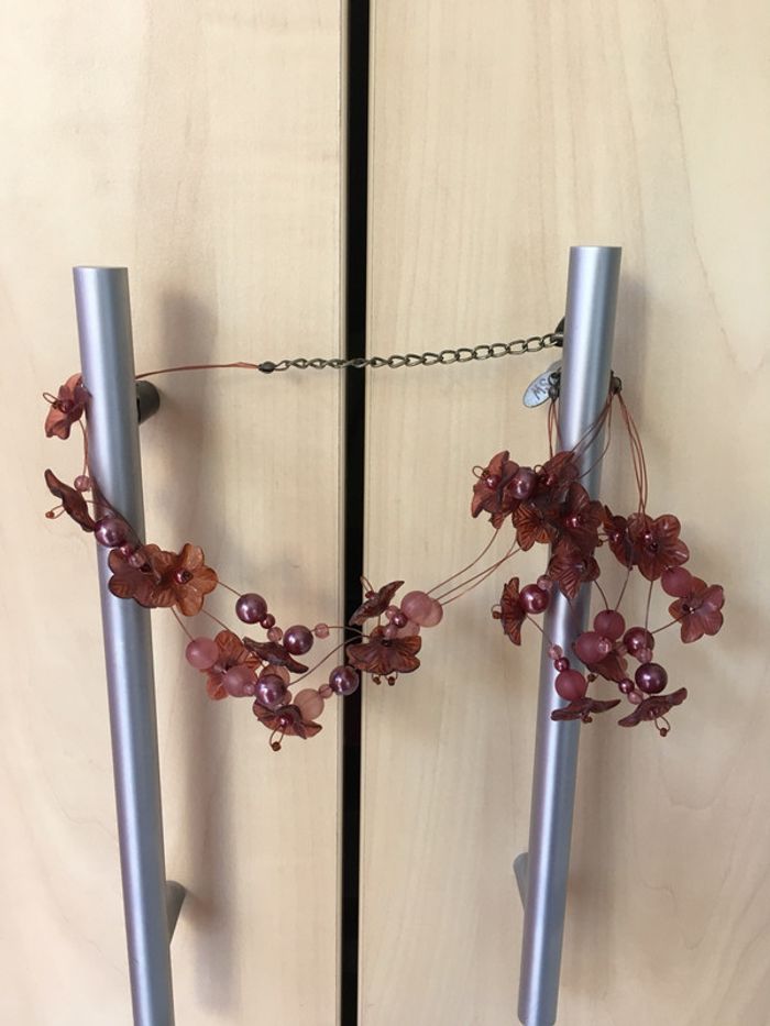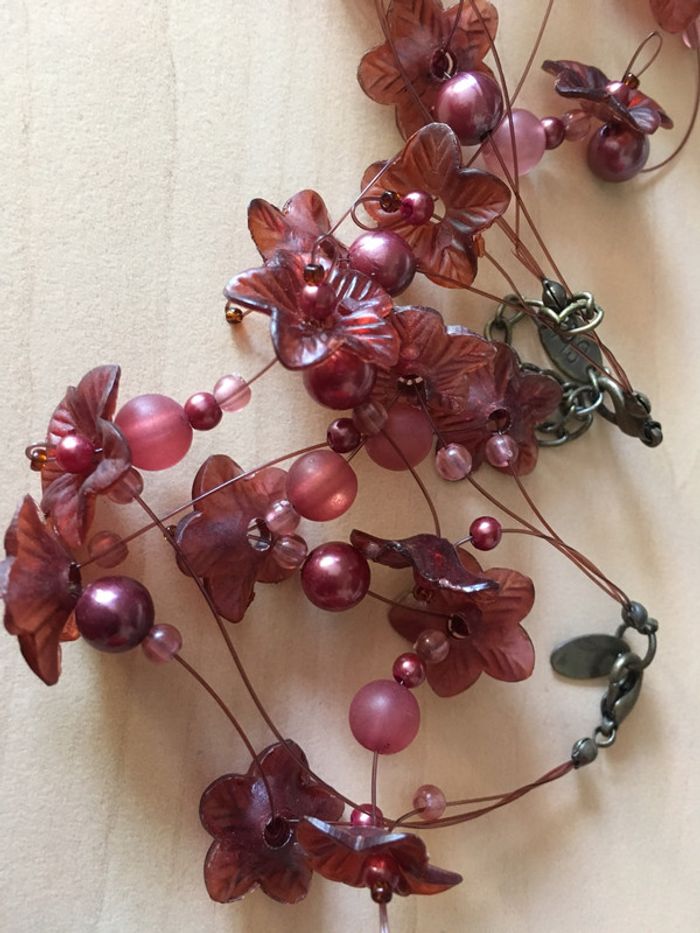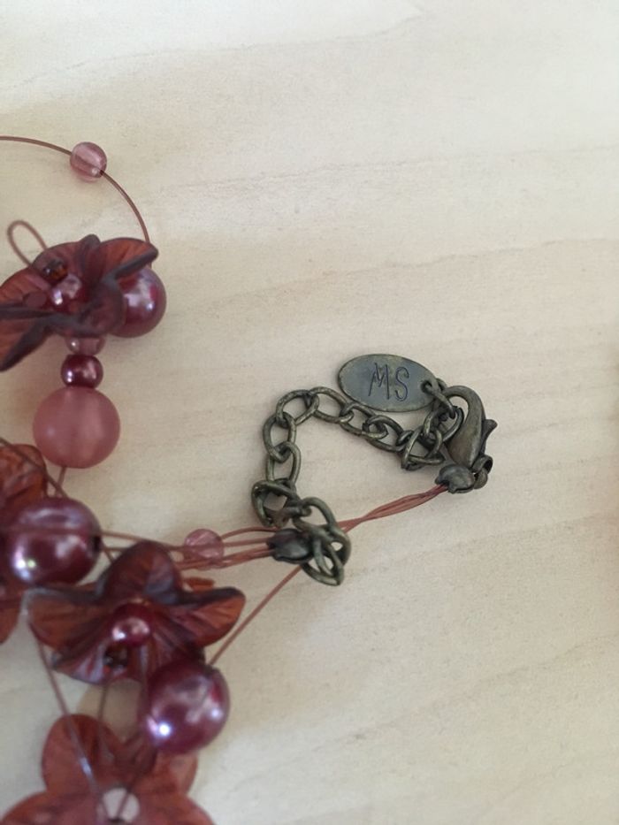 Ensemble bracelet et collier ras du cou, couleur vieux rose fleuris. De la marque: “ MS “.