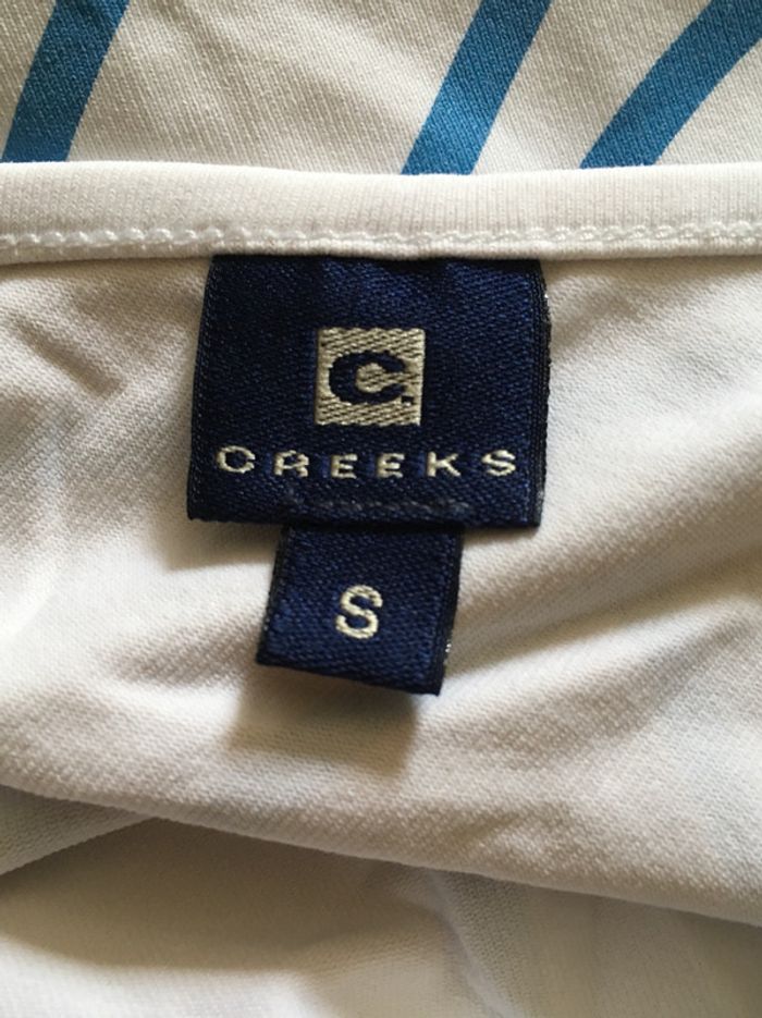 Top asymétrique blanc et bleu, épaule dénudée sur un côté. De la marque « Creeks » . taille S, ce top a été porté, présente quelques légères petites bouloches voir photo . Idéal pour cette saison, il ravira avec votre jean ou avec votre short.