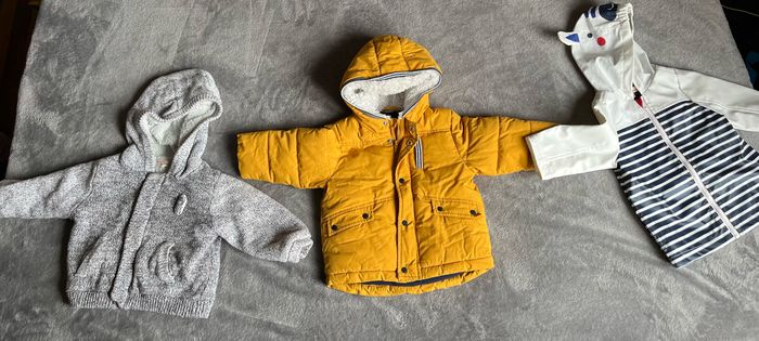 Manteaux en très bon états très peu utilisés voire jamais utilisés, pour bébés. De marque Okaïdi pour le manteau jaune et Du pareil au même pour les deux autres. Le manteau blanc rayé est un manteau taille 6 mois qui n’as jamais été porté.