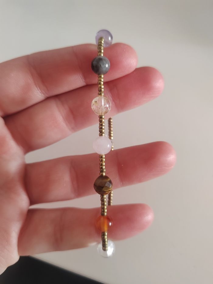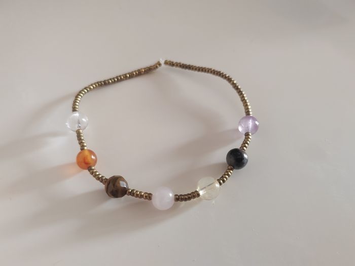 Bracelet des 7 chakras aux pierres naturelles ( cristal de roche, cornaline, œil du tigre, quartz rose, citrine, labradorite et améthyste) de 6mm avec des perles. 19 cm de tour de poignet mais assemblé sur du fil élastique Fait maison facture des pierres naturelles à l'appuie.