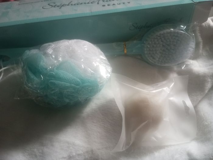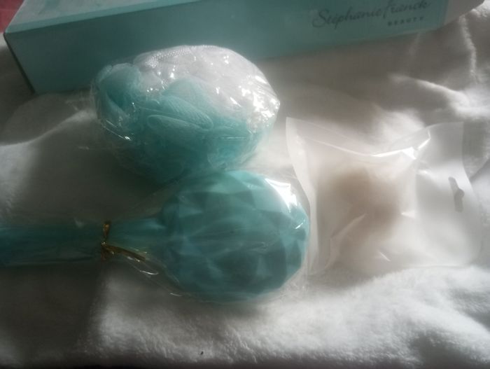 Kit accessoires douche ou bain contient Une brosse de bain Une fleur de douche Et une éponge konjac blanc naturelle visage Neuf dans son coffret couleur vert d eau