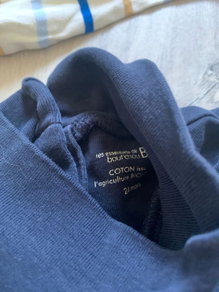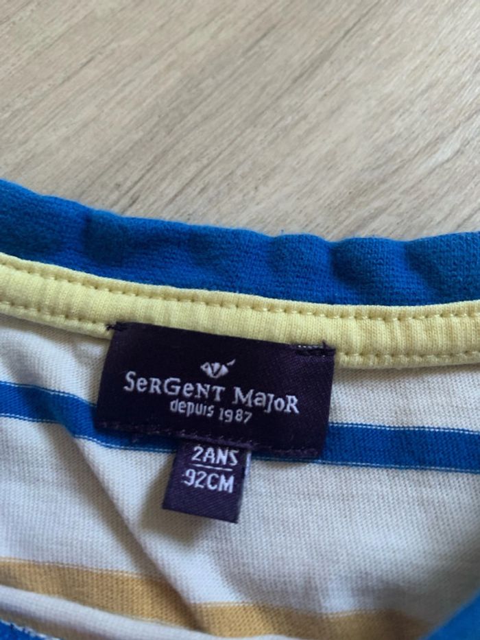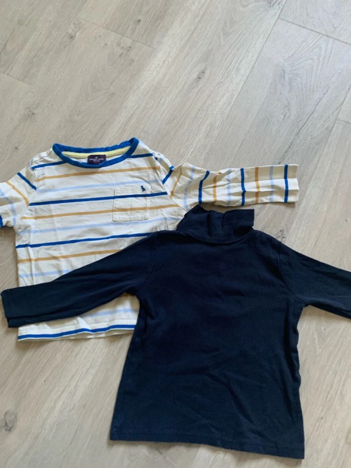 Lot de deux tee-shirt manches longues, 24 mois en très bon état - un bleu marine à col roulé en coton bio marque boutchou en très bon état - un écru avec rayures bleues et jaunes, sergent major en très bon état 24 mois