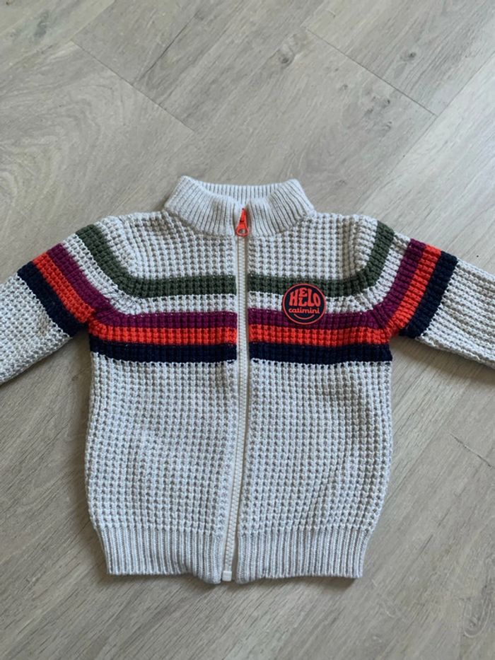 Veste zipée Catimini, couleur mastic avec rayures orange/kaki et marine 2 ans En très bon état Contient de la laine (cf étiquette compo)