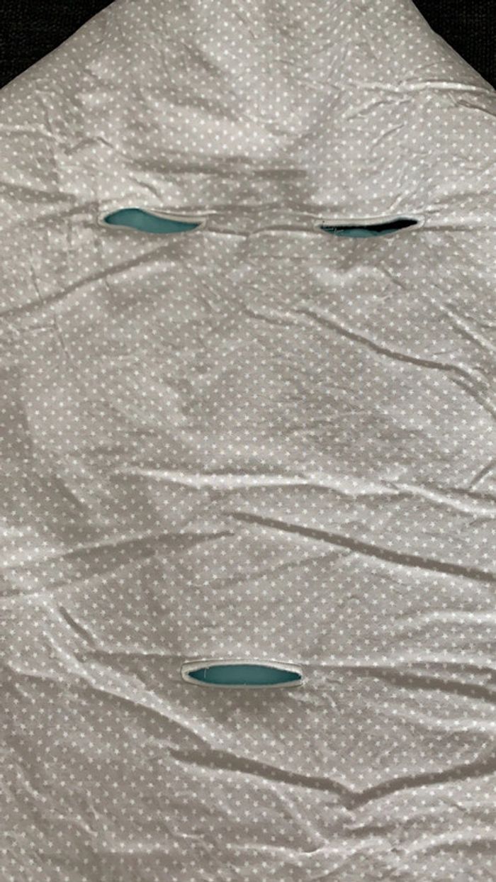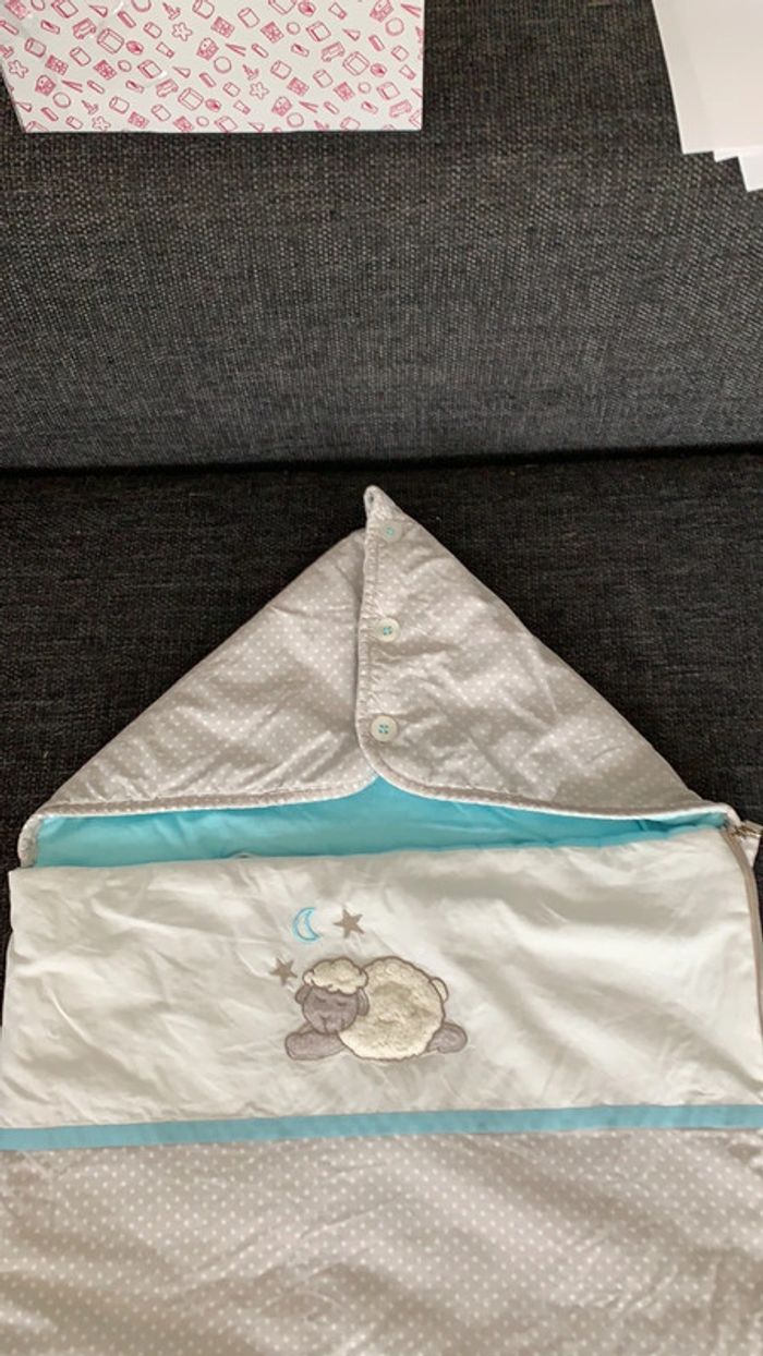 Nid d’ange S’adapte au cosy, idéal sortie de la maternité ou pour des balades au chaud en poussette Gris et turquoise, imprimé étoile blanche sur fond gris avec joli petit mouton brodé Possibilité capuche en fermant 3 boutons Marque carré blanc, quelques bouloches sur la partie bleue turquoise à l’intérieur Et mini point (tache? : cf photo) très discret à l’arrière Reste en très bon état dans l’ensemble #chlo4242accessoiresenfant