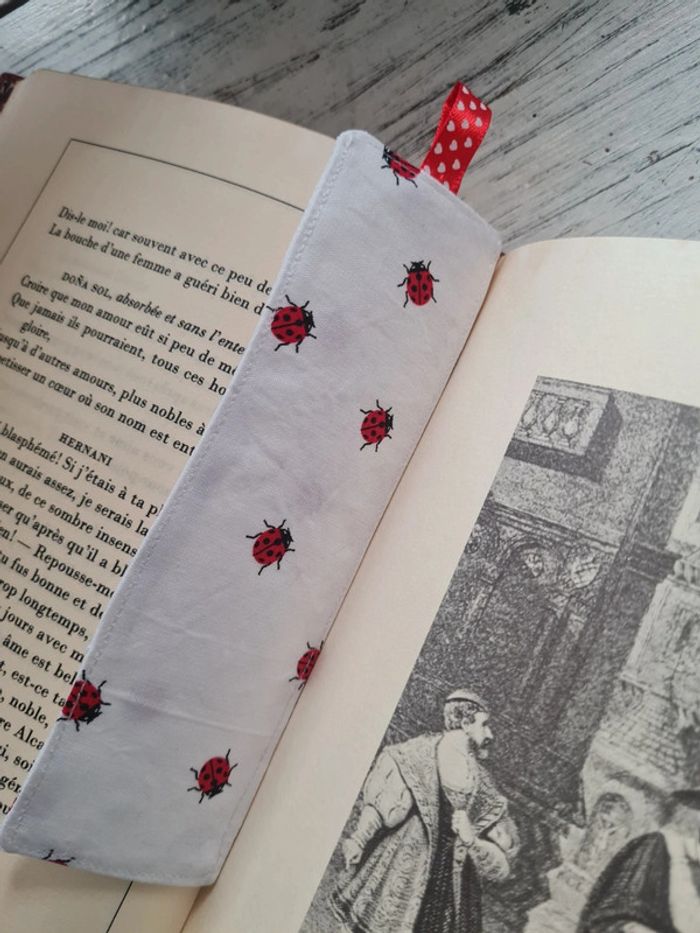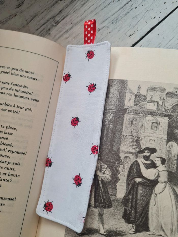 Marque page en tissu avec ruban. Confection artisanale Thermocollant entre les deux couches de tissu coton. Dimension: 15,5 cm x 5 cm