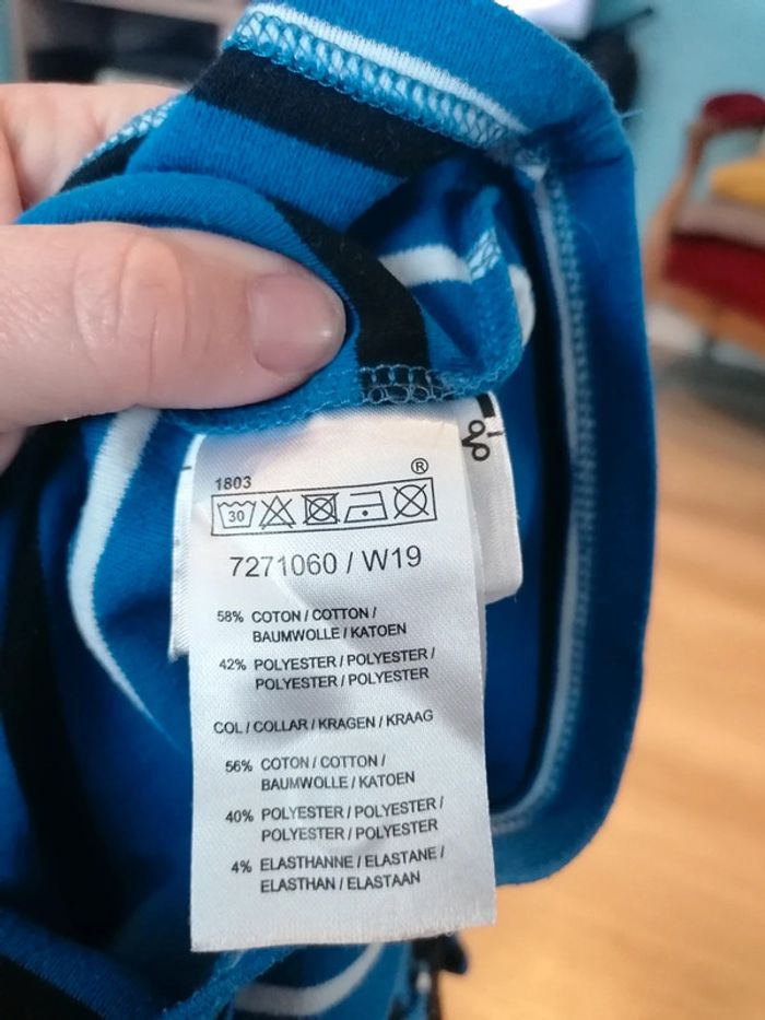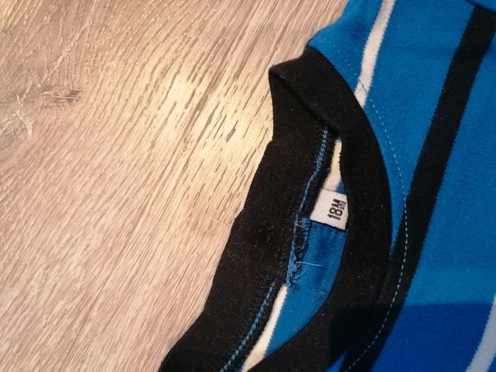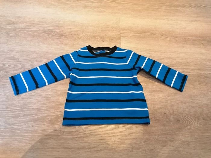 Bonjour, je vends ce tee shirt à manches longues rayé marine, bleu et blanc taille 18mois en très bon état. Lavé maison non fumeur.