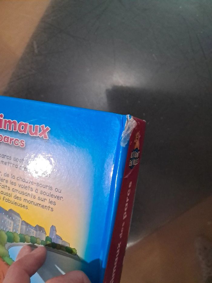 #Prissou026livre Découvrez les animaux des parcs en soulevant les volets avec votre boutchou. Le livre est un peu abîmé sur la page de présentation et sur la fentes. Le raton a été arraché et la statues christ rédempteur également. Sinon le reste est bon état.