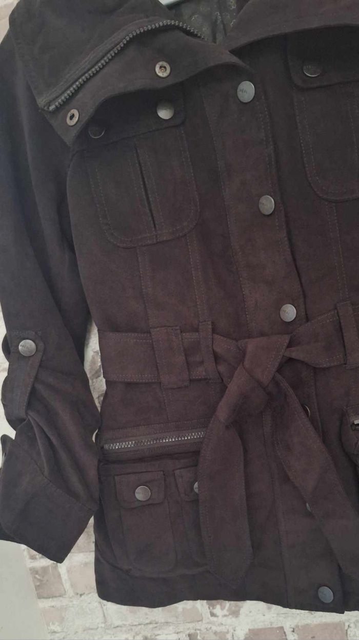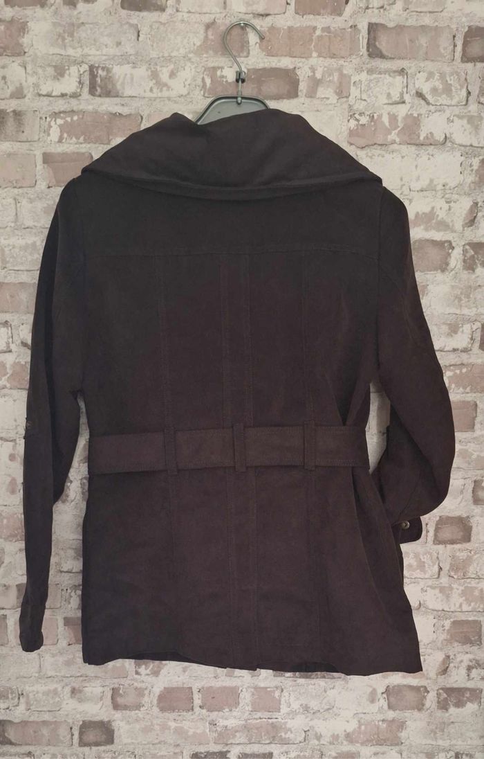 FEMME 38 / M N°2452 veste chic marron Au Touché peau de pêche / suedine Fermeture eclair + pression Ceinture , poche Capuche retratable dans le col fermé par une Fermeture eclair 100% polyester Longueur 69 cm Taille 38 / m Bréal Neuf sans étiquette 🏷 25€ #kelly_femmeT38