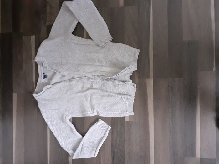 Beau gilet en maille gris clair, légèrement pailleté. Fermeture par boutons. Taille : 10 ans Marque : Kiabi Très bon état