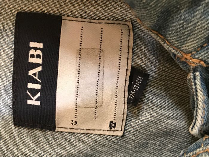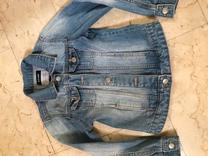 Veste en jean denim de coton Coupe droite. Col chemise Ouverture devant boutonnée,. 2 poches poitrine Manches longues avec bouton-au poignet de manche. Coton: 100 % Age : 8 Ans Très bon état Marque : KIABI
