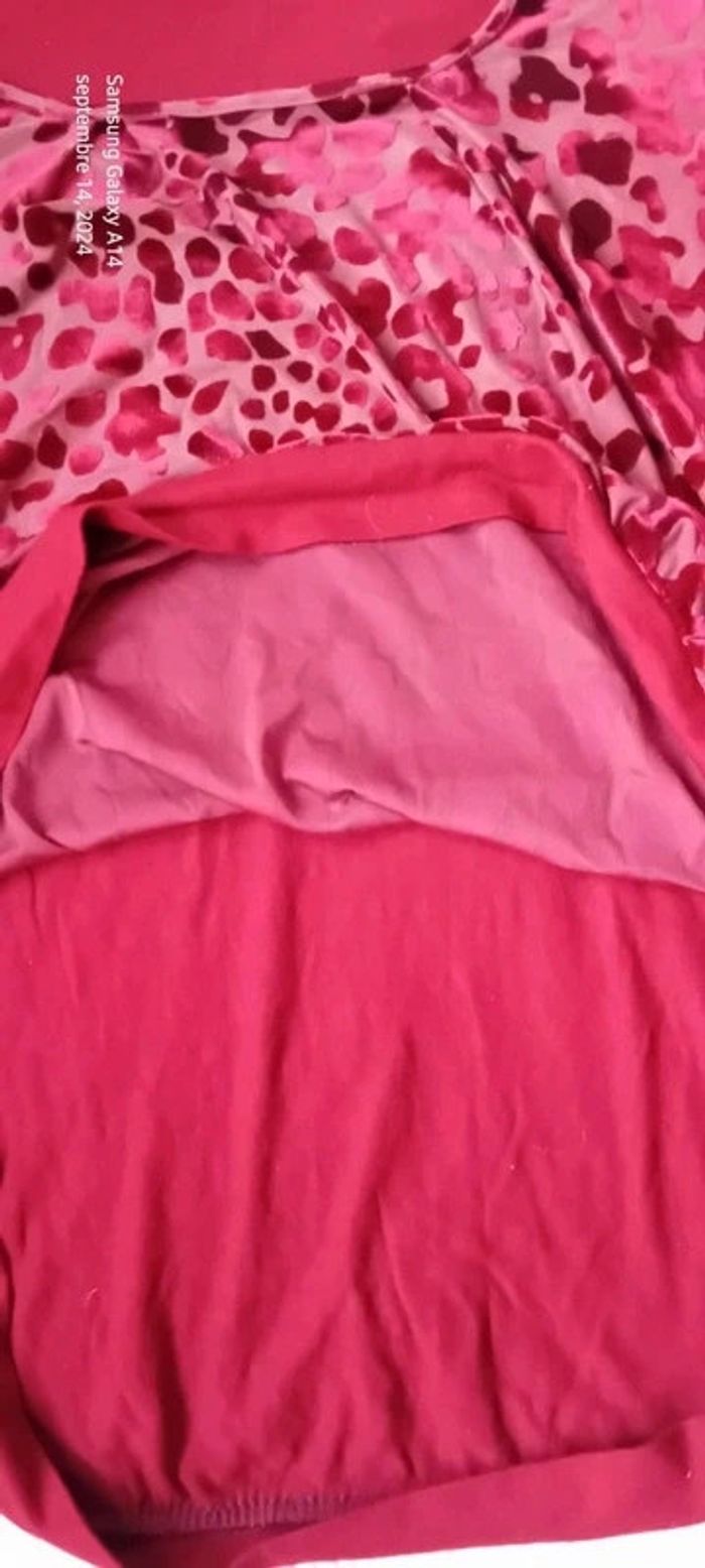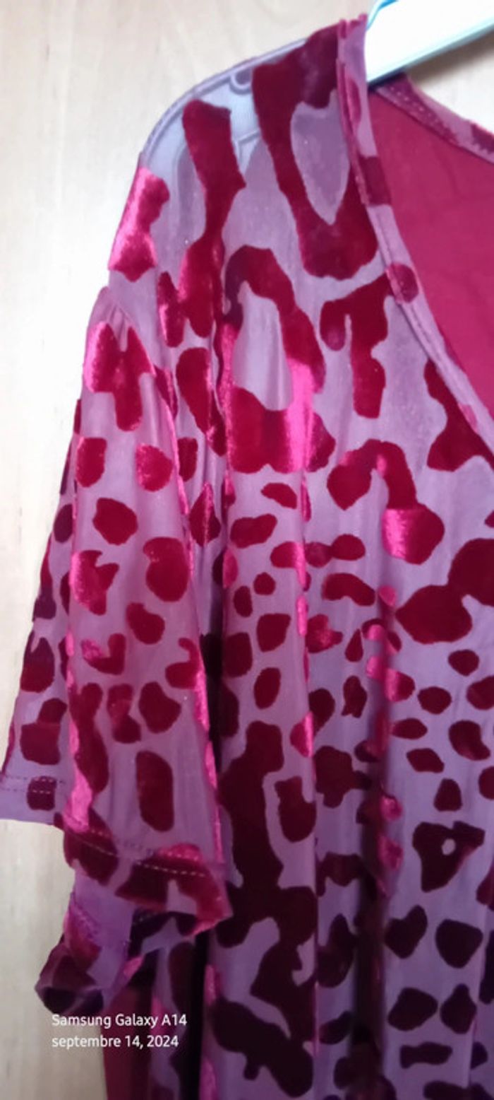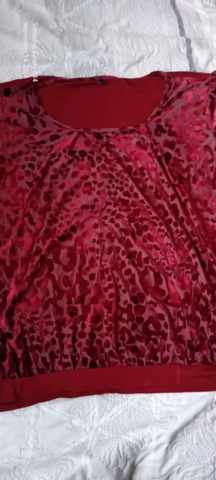 Haut manches courtes en polyester viscose et elastanne matière fluide et légère motif leopard aspect velours et voile semi transparente longueur 63 cm largeur aisselles à aisselles 56 cm largeur épaules 46 cm peu portée en bon état ⚠️ juste un tout petit accroc en haut au dos pas visible au porté (voir dernières photos)#midole #midolefemme44 #midolefemme #hautfemme44 #hautmotifleopard #motifleopard #femme44 #rouge
