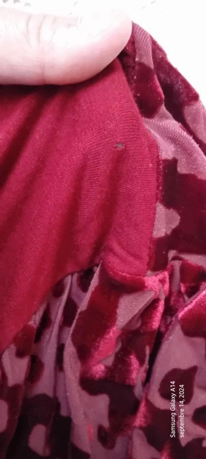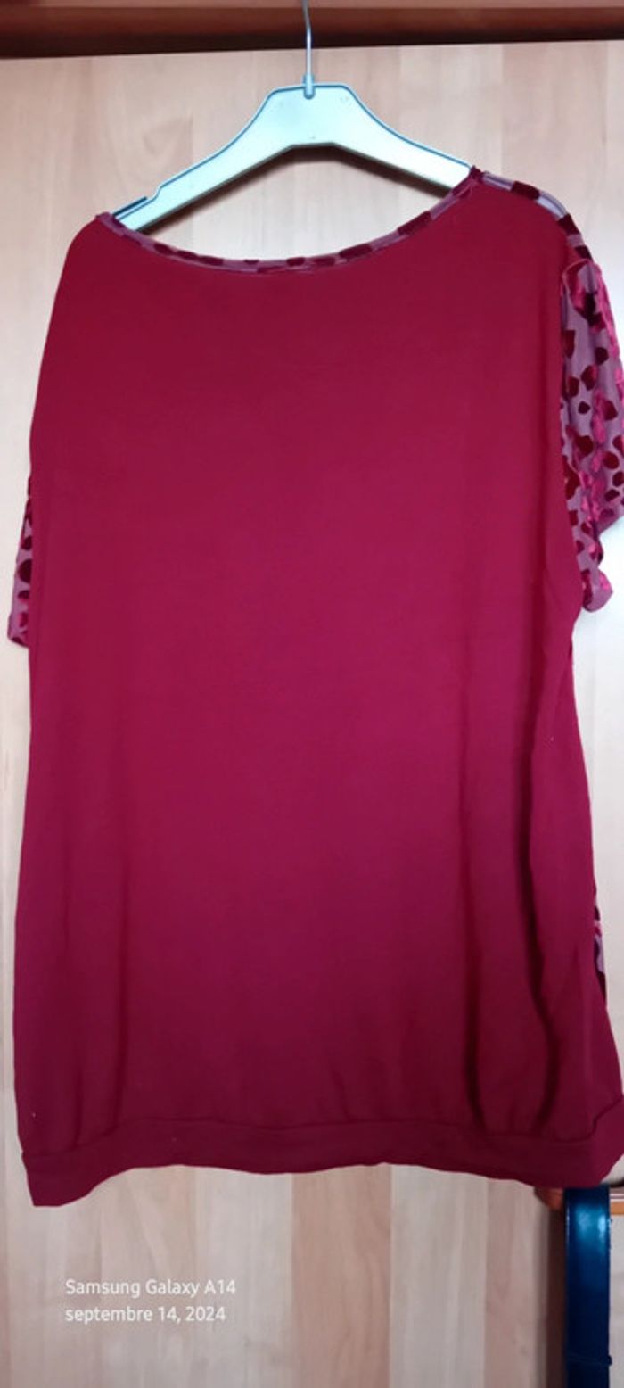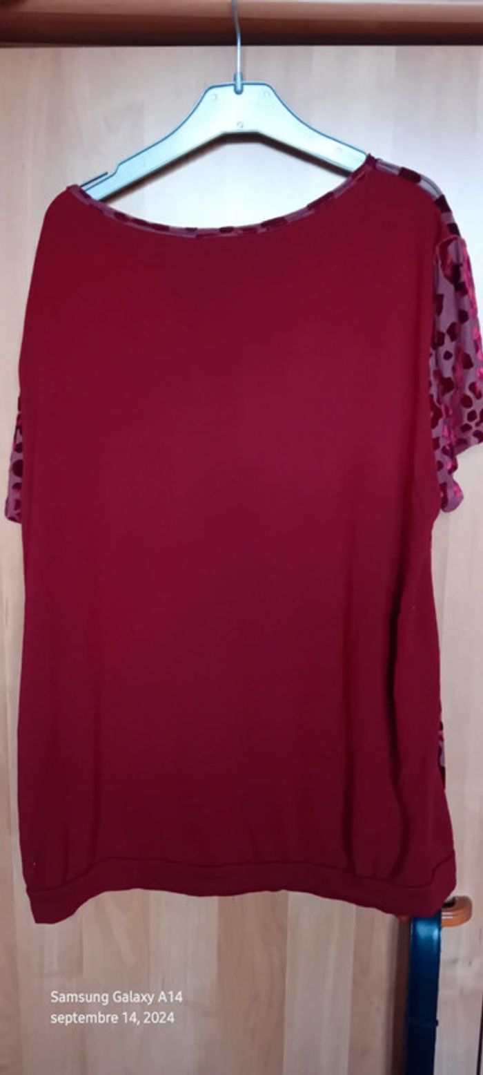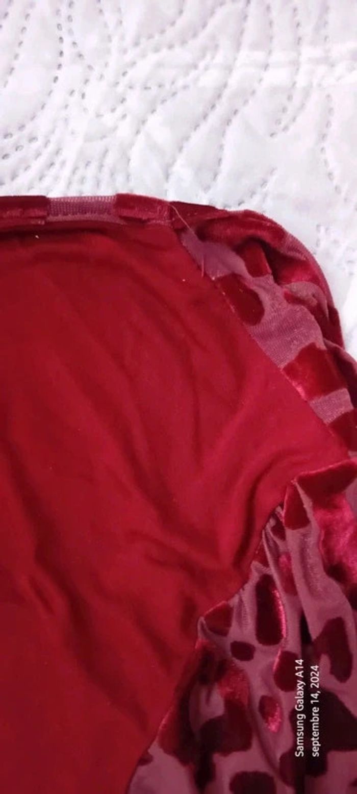 Haut manches courtes en polyester viscose et elastanne matière fluide et légère motif leopard aspect velours et voile semi transparente longueur 63 cm largeur aisselles à aisselles 56 cm largeur épaules 46 cm peu portée en bon état ⚠️ juste un tout petit accroc en haut au dos pas visible au porté (voir dernières photos)#midole #midolefemme44 #midolefemme #hautfemme44 #hautmotifleopard #motifleopard #femme44 #rouge