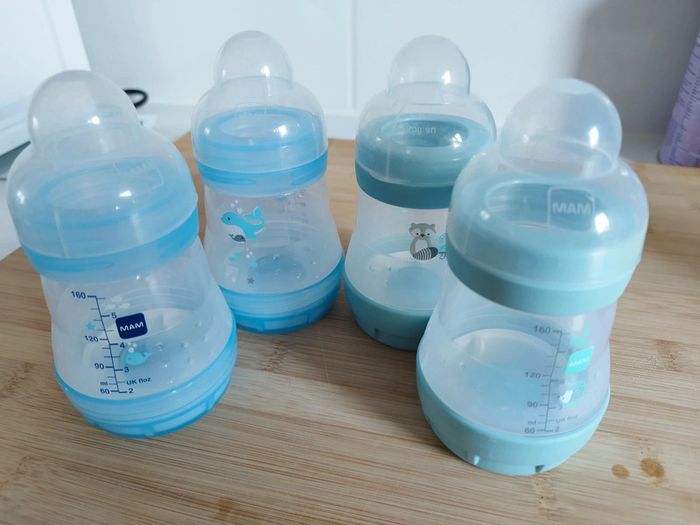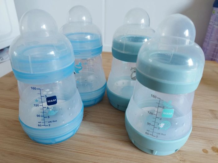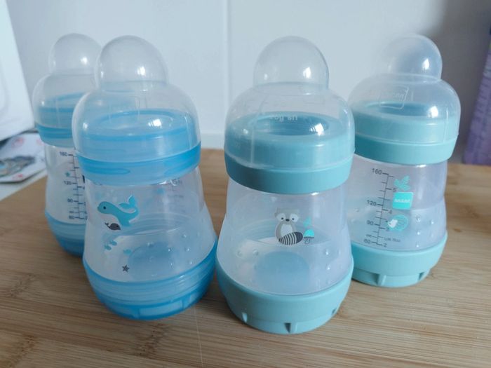 Lot de 4 biberons Mam 160 ml. Vendus sans tétine.