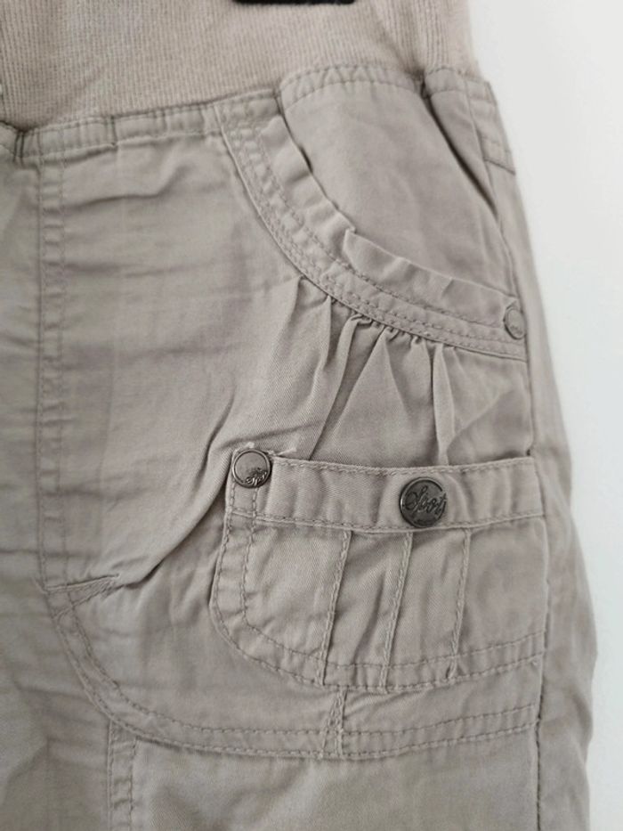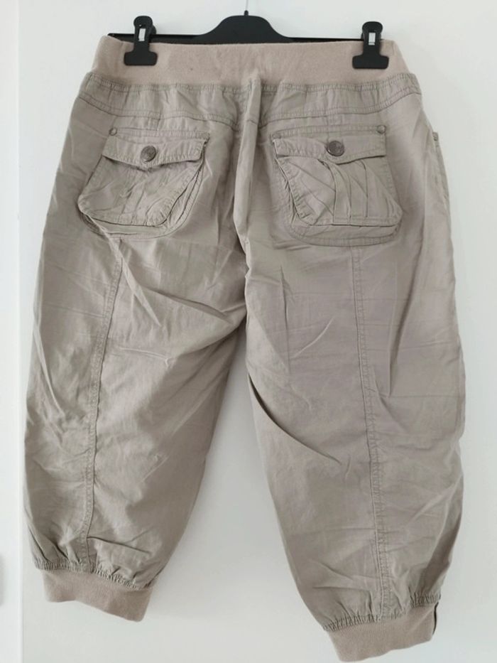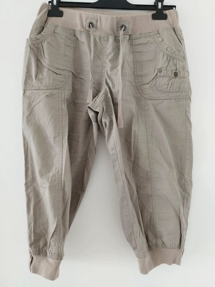 Pantacourt avec poches sur le devant le côté et derrière. Galon à la ceinture et resserré sur le bas des jambes.