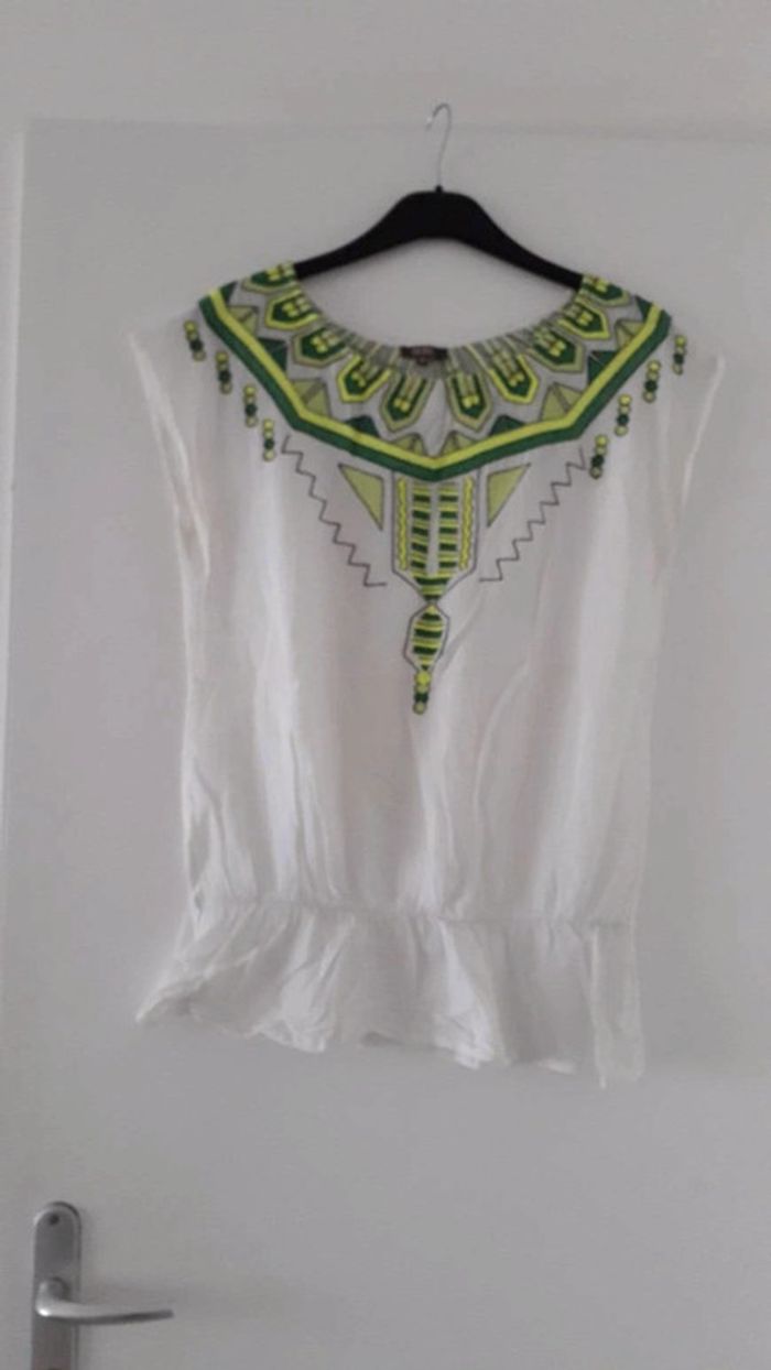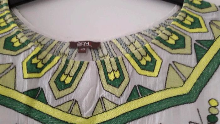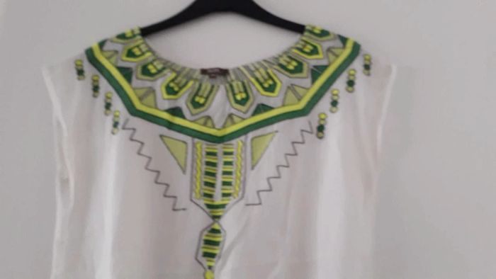 Tunique avec motifs verts sur le col ainsi que derrière. Resserré dans le bas.