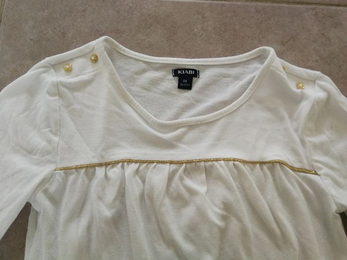Tee shirt manches longues fille taille. Liseré doré poitrine et boutons dorés aux épaules. Petite tâche sur le devant.