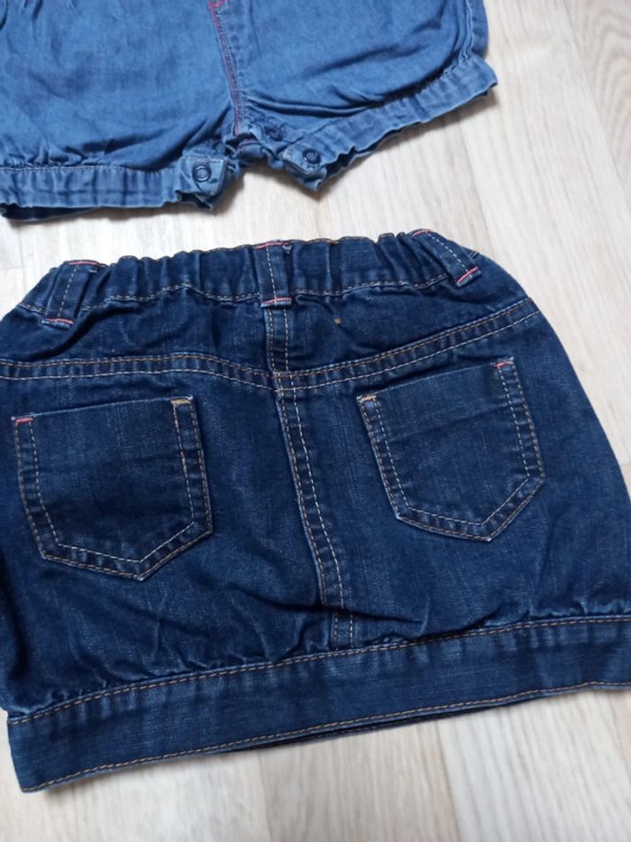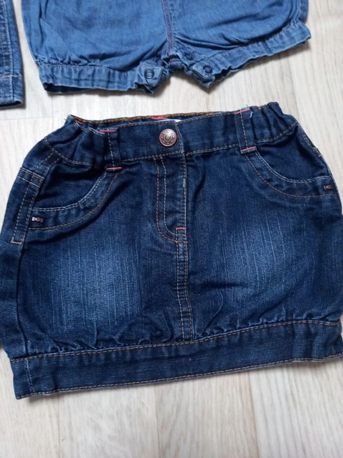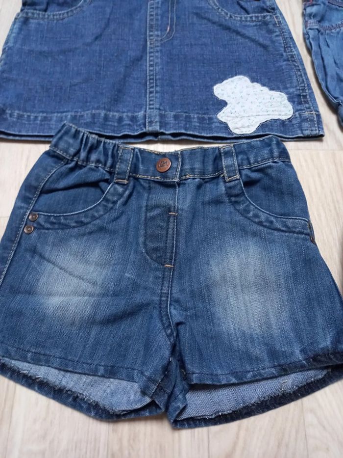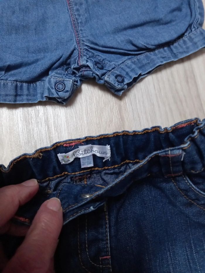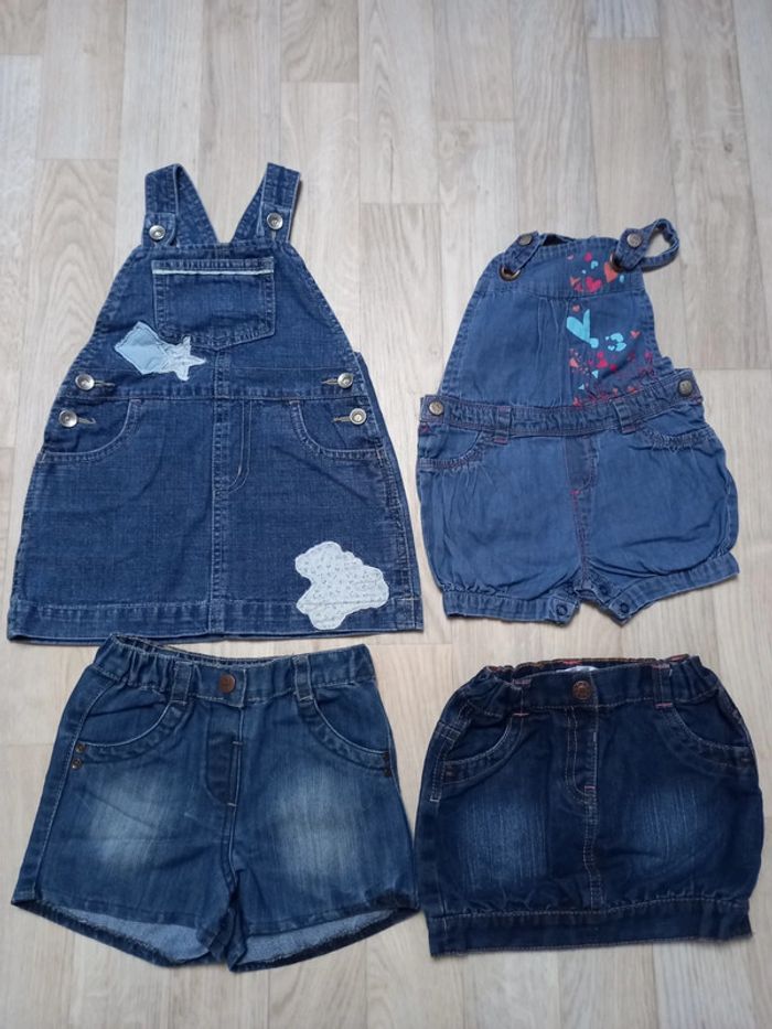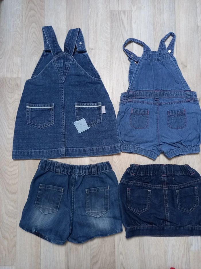 Lot de 4 vêtements en jean en excellent état 1 short marque Kitchoun 1 jupe salopette marque Lulu Castagnette, 1 jupe Kitchoun 1 short salopette marque In extenso #mamoune1906_fille_18mois