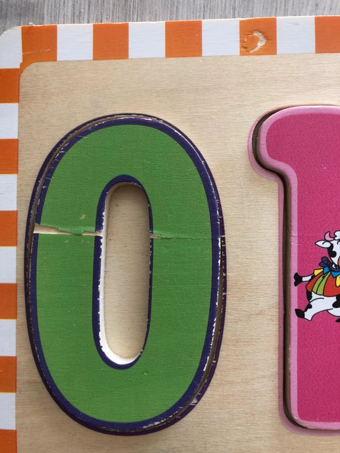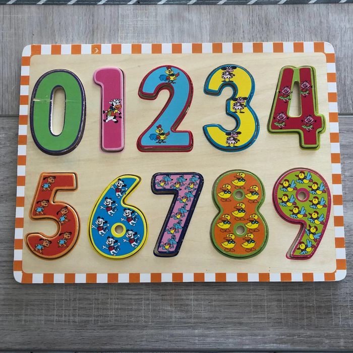 puzzle en bois en tres bon état le chiffre 0 est un peu abîmé + petit défaut sur le cadre du support (voir photo)
