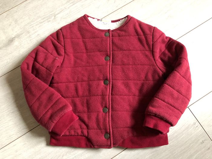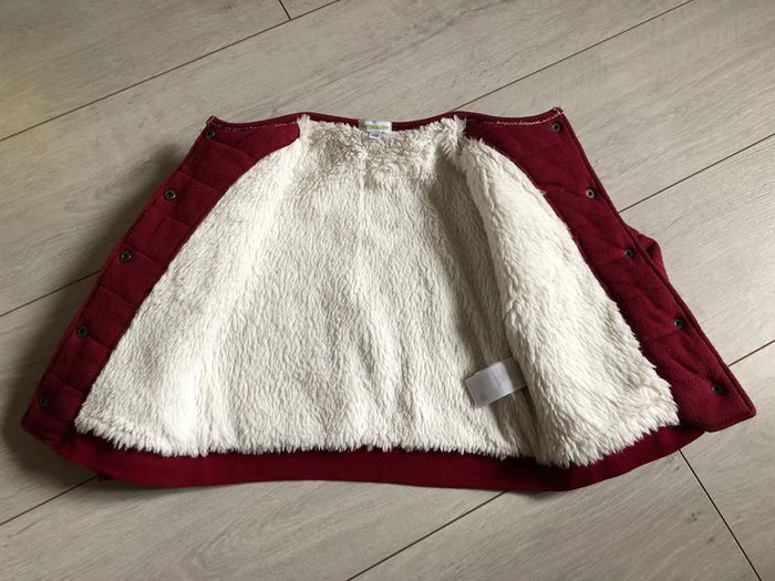 veste Bordeaux doublée fausse fourrure de marque Vertbaudet en bon état, légèrement bouloché par les lavages + surpiqûres qui se sont décousues par endroit (voir photo)
