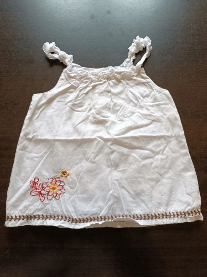 Blouse KIMBALOO Blanche avec broderie colorée dans le bas Fines bretelles volantées Fermée par pressions dans le dos Doublée 100% Coton TAILLE 24 MOIS TRES BON ETAT Allez voir mes autres ventes!