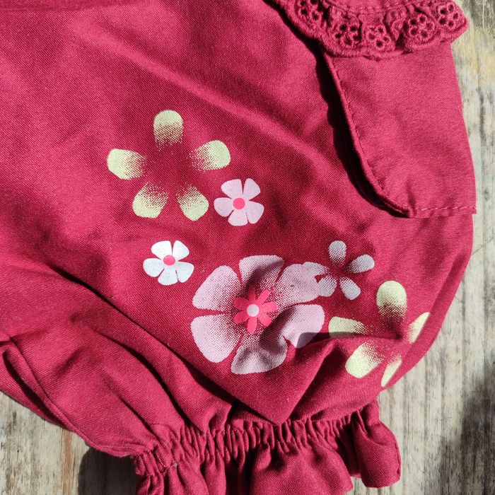 Pantalon bordeaux - 3 Mois Très joli pantalon bordeaux-violine Taille élastique et bas froncé pour que le pantalon ne remonte pas sur les petits mollets de votre princesse 2 petites poches avec de la dentelle Dessins de fleurs jaunes et rose en bas à gauche Taille : 3 mois Matière dessus : 100% polyester Matière doublure : 100% coton #bebefille3moisrose64121