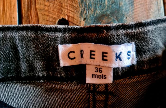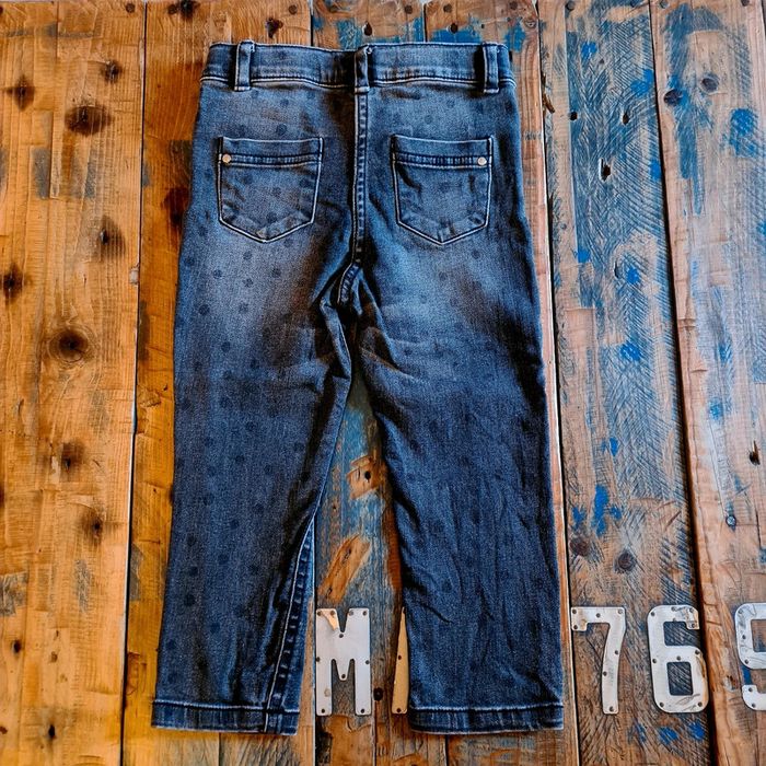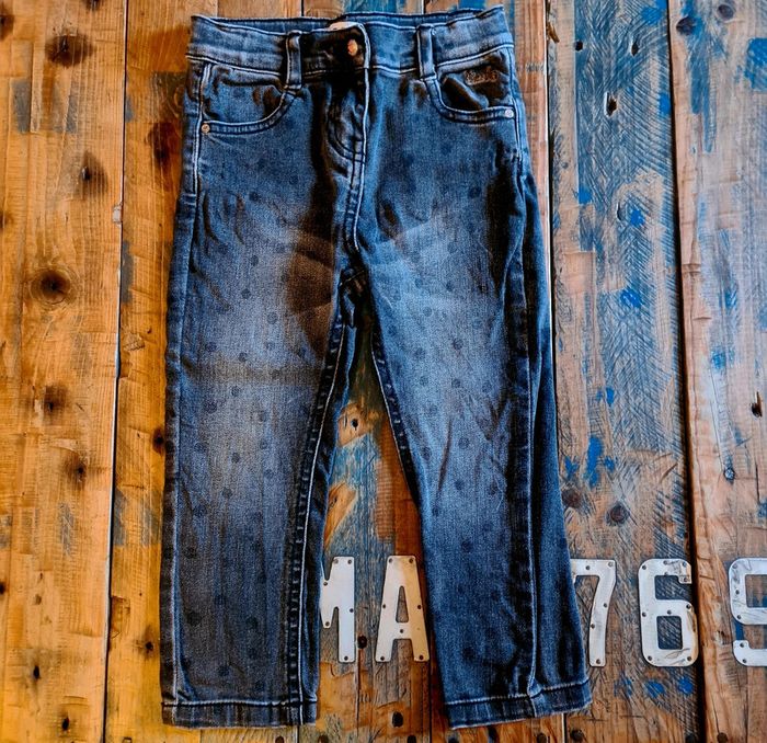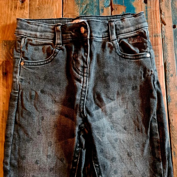 Joli jean slim imprimé petits pois noirs sur denim noir délavé. De la marque Creeks en taille 36 mois. Tres bon état.