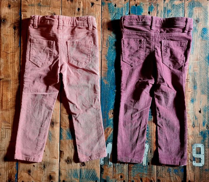 Lot de 2 pantalons en velours cotelé pour bebe fille en taille 3 ans. De 90 a 97 cm. En parfait état. Coloris violine et rose poudré.
