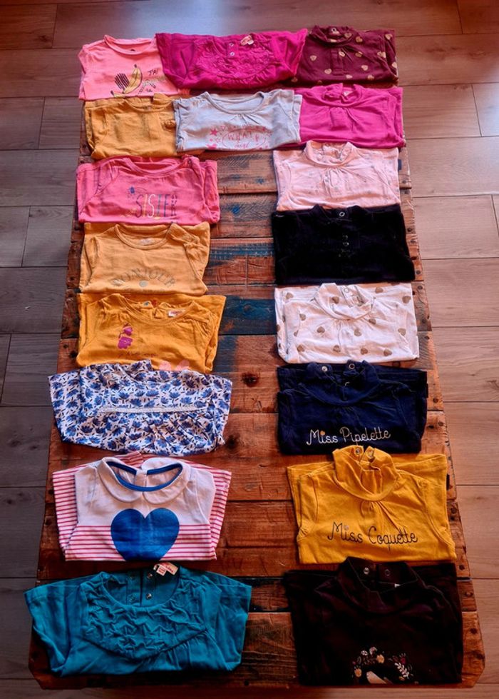Lot de 18 tee shirts a manches longues pour bebe fille en taille 6 mois. Differentes marques. En bon état. Possibilité de faire 2 lots de 9.