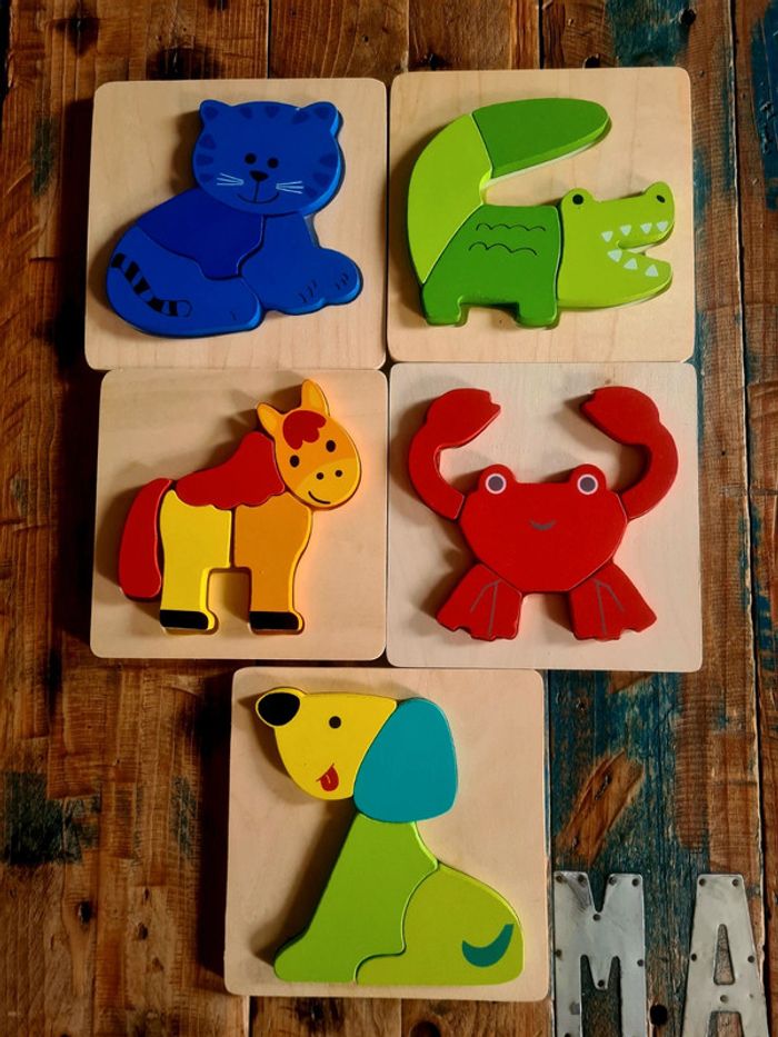Lot de 5 jolis puzzles en bois pour enfant à partir de 18 mois. Excellent état. Motifs animaux.