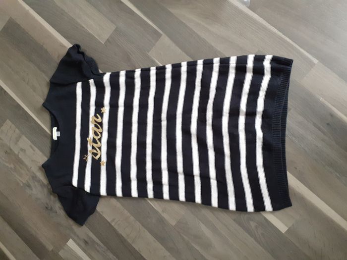 Belle robe maille, rayée noir et blanc, inscription dorée 'star", manches courtes. Taille : 10 ans Marque : Vertbaudet Très bon état