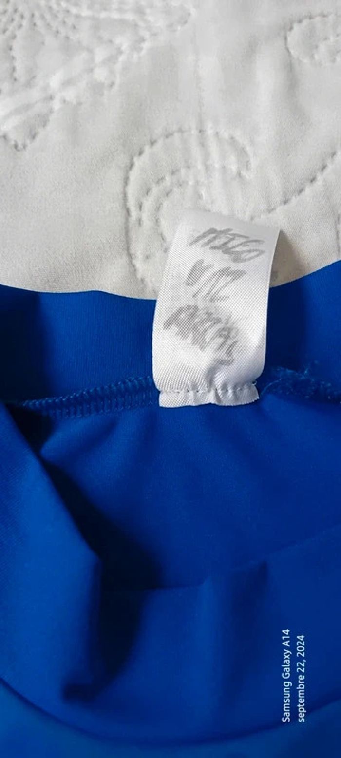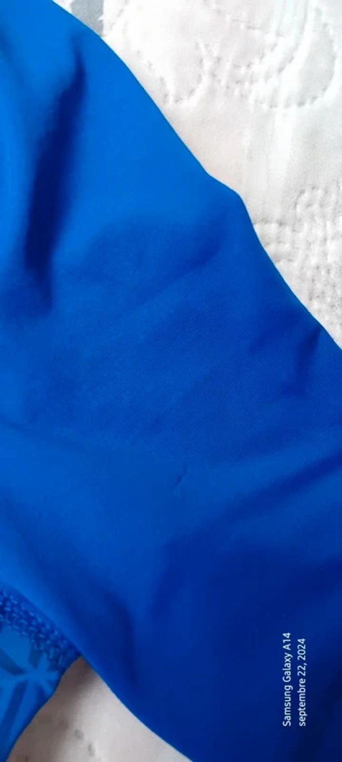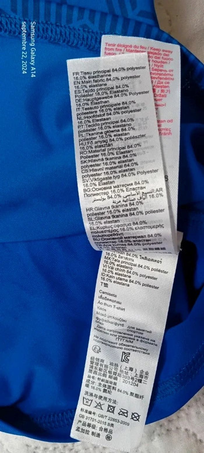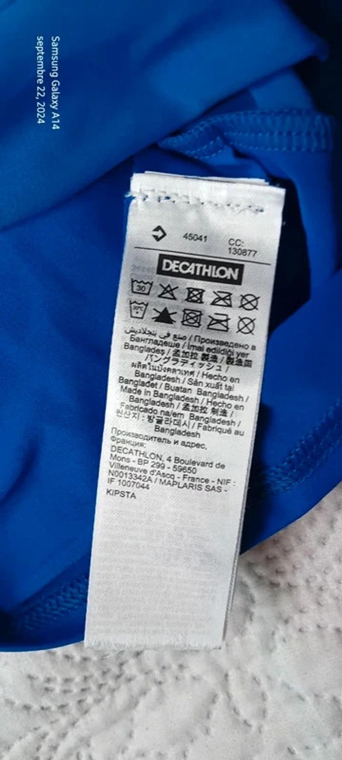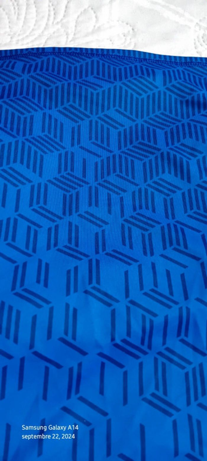 Maillot de sport manches courtes col montant en polyester et elastanne matière fluide et extensible bleu avec motifs géométriques longueur 55 cm largeur aisselles à aisselles 33 cm très peu porté en bon état ⚠️ juste un petit fil tiré à une manche et nom sur l étiquette (voir dernières photos) #midoleenfant #midolegarçon #midolegarçon12ans #maillotdesport #maillotdesportkipsta #maillotdesport12ans #sport #bleu #décathlon #kipsta