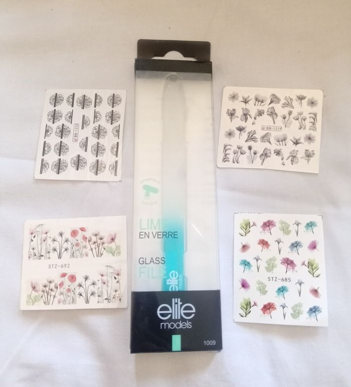Lot 2: grande lime en verre Élite + 4 planche décalcomanies