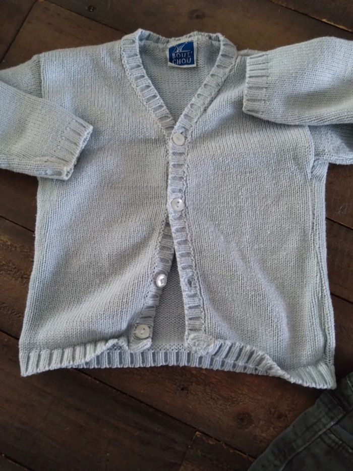 Marques divers Gilet bleu clair bon état Pantalon jean gris foncé anthracite a pois un peu déchiré Au genou T shirt bon état