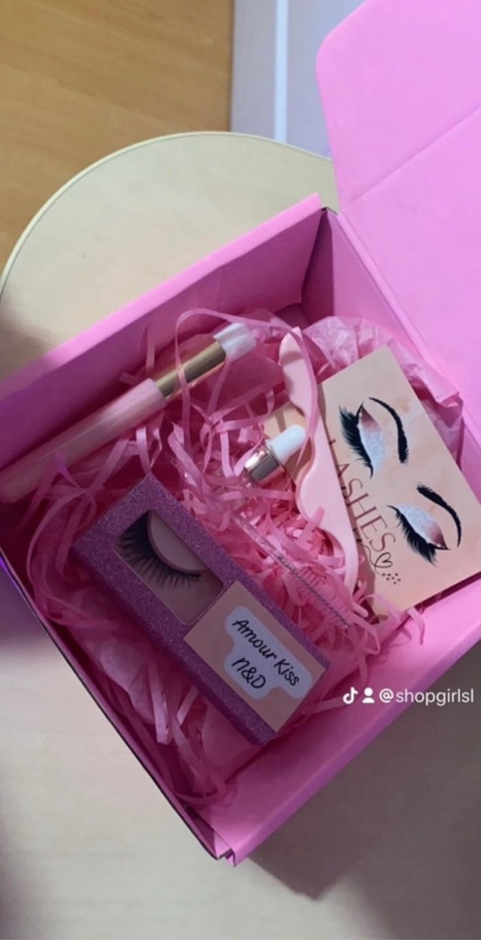 Voici un coffret faux cil personnalisé avec sa petite brosse et sa petite huile pailletée ainsi que sa brosse shampoing pour laver les faux cils .