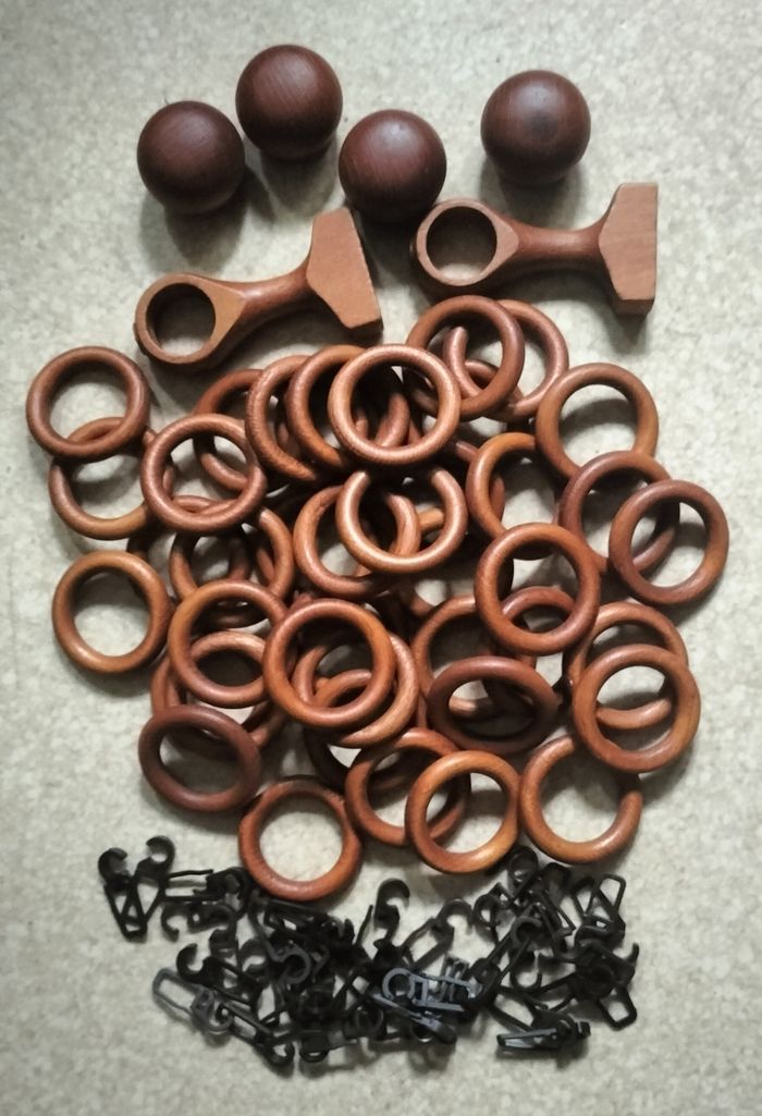 Lot anneaux et supports pour barre a rideaux Pour petite barre Diamètre intérieur 35mm Excellent état Couleur bois 2 supports 4 fin de barre 40 anneaux 40 crochets Le lot 8€