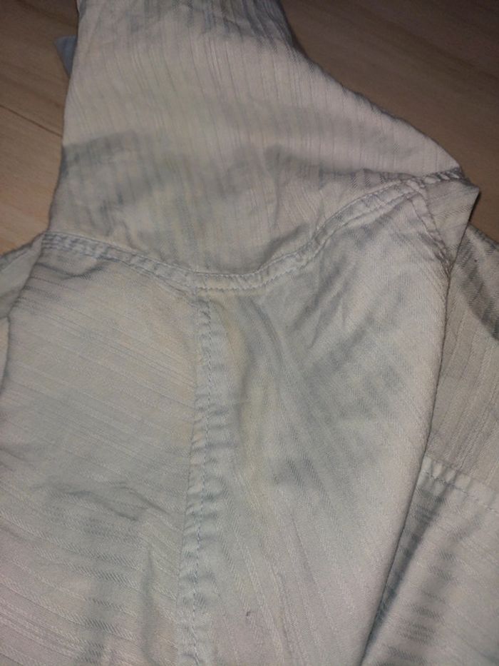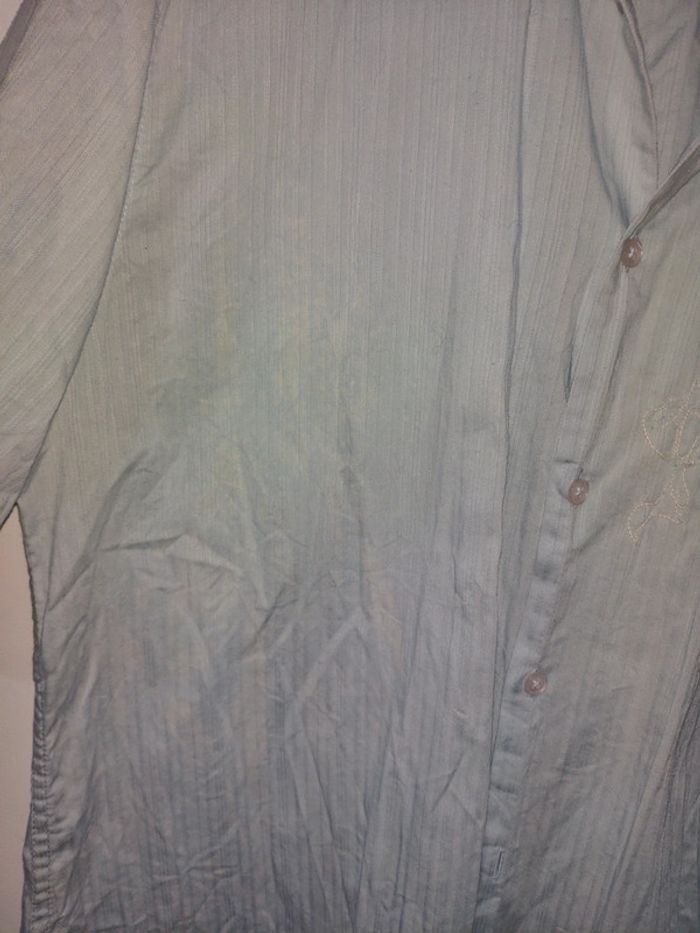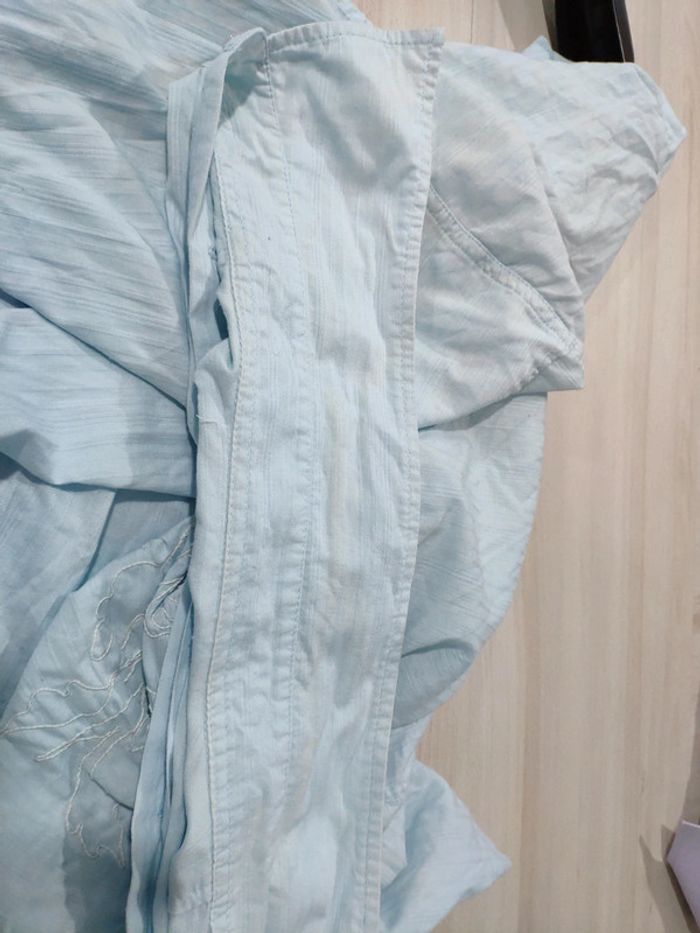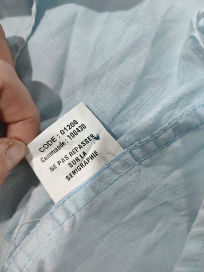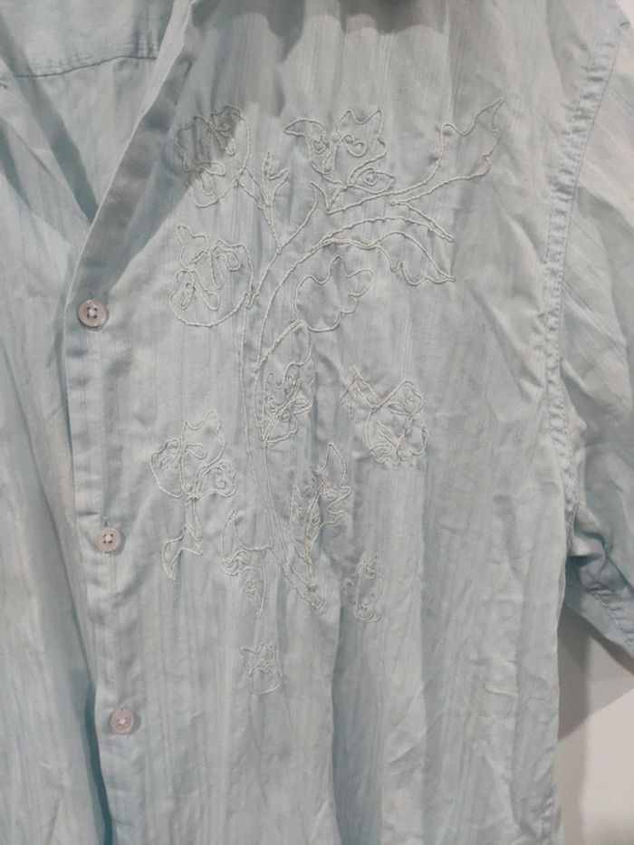 Chemise chemisette homme bleu clair Jules XL taille ajustée. Tachée sur le volet l'épaule. Tachée sur l'avant (blanchi). Se voit peu sur l'ensemble au final . Sérigraphiée, sorte de broderie. #melpi08homme