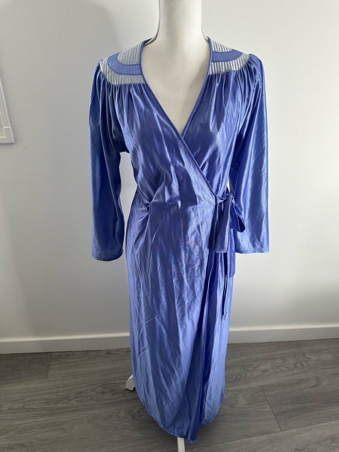 Peignoir kimono long satiné bleue lila Nouvelles Galeries Vintage T42 XL