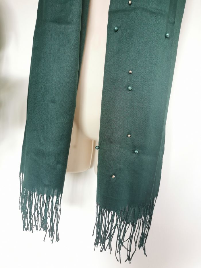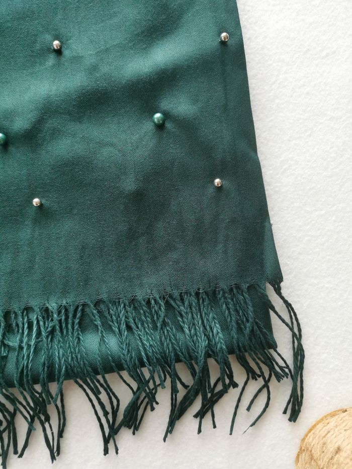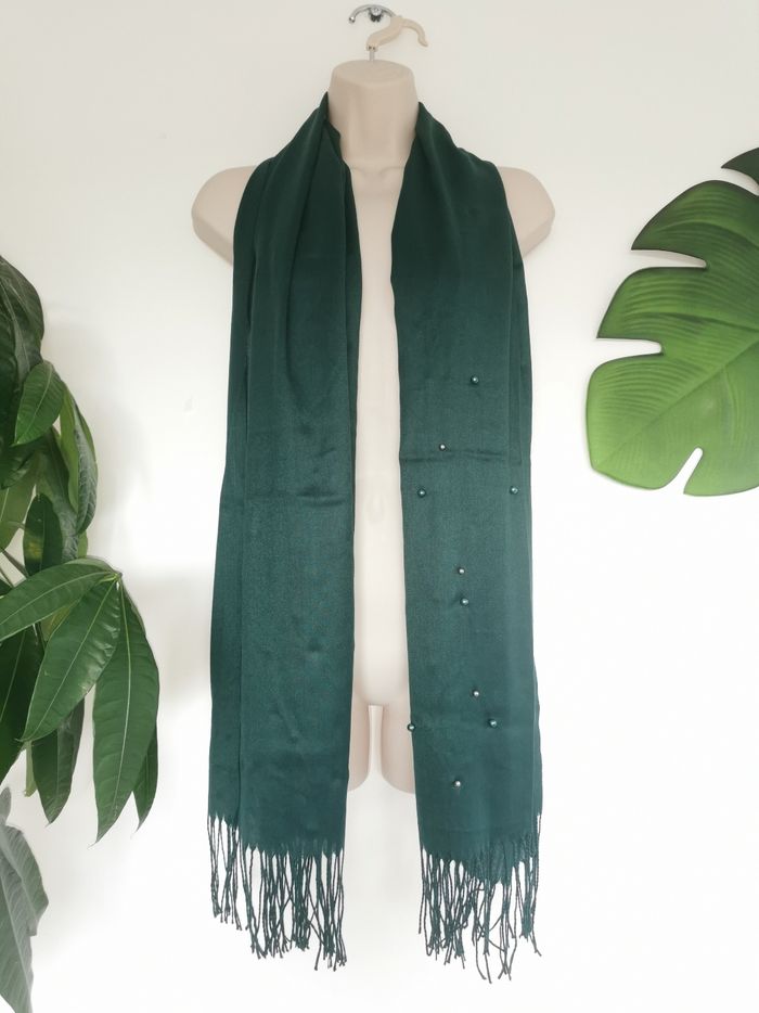 🧣 ÉTAT DE L'ARTICLE: 10/10 ✅️ Sans étiquette, jamais porté Châle, écharpe 🧣 • Matière: 100% viscose • Tissu léger et doux • Bords à franges • Détails Perles 🦪🦪🦪 sur une extrémité • Couleur: Vert sapin 🌲 • 📏 Dimensions: 170 X 62 cm Parfait état👌, jamais porté 🔵